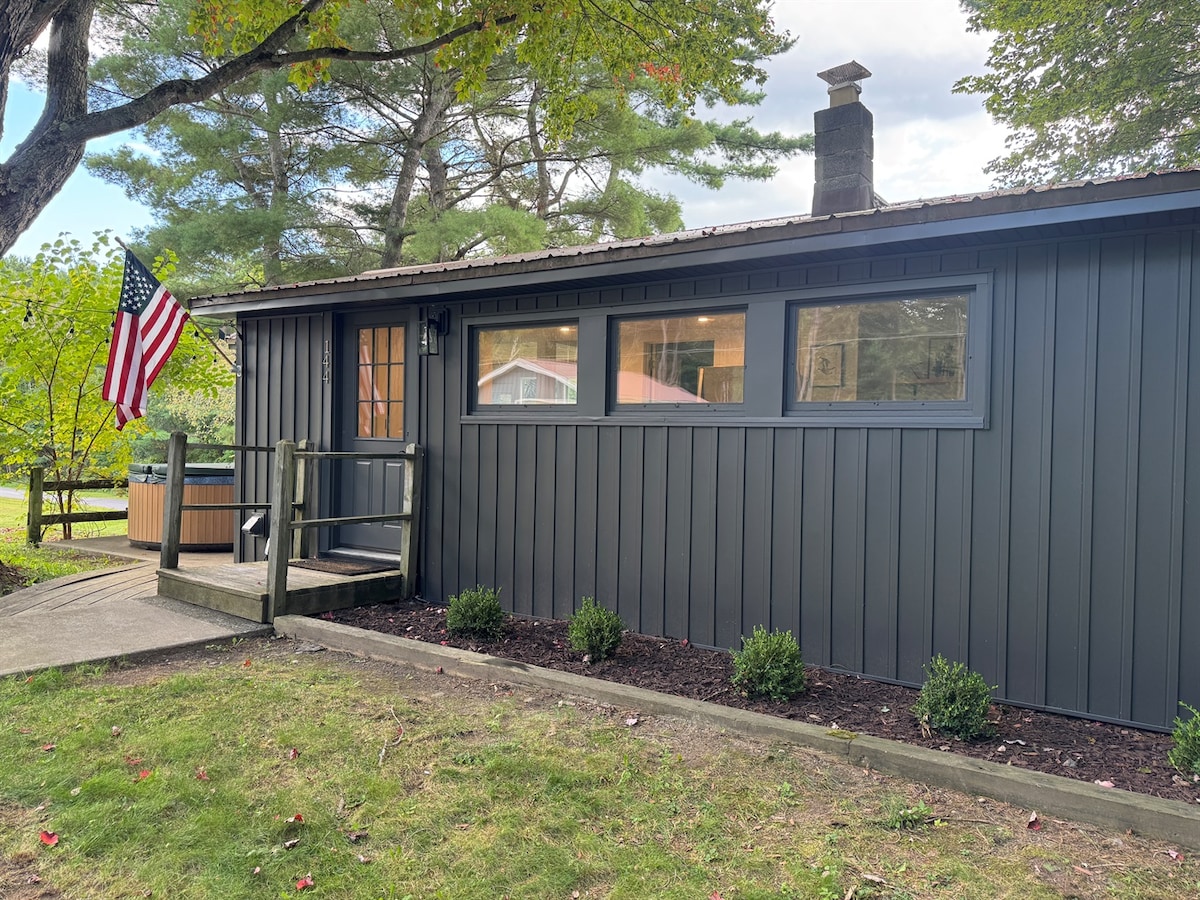 Pet-friendly chalet with hot tub, private shoreline, gameroom, coffee bar, reading nook, and cozy wood-burning stove. Nestled amongst the trees, this home offers: o Your own private shoreline with firepit, fishing rods, kayaks and paddleboat; o Hot tub overlooking the lake; o 5.5 acres to explore with wooded trails, limestone cliffs, and winter views; o Gameroom with ping pong, air hockey, foosball, and Xbox; and o Proximity to waterfalls, hikes, biking & skiing.