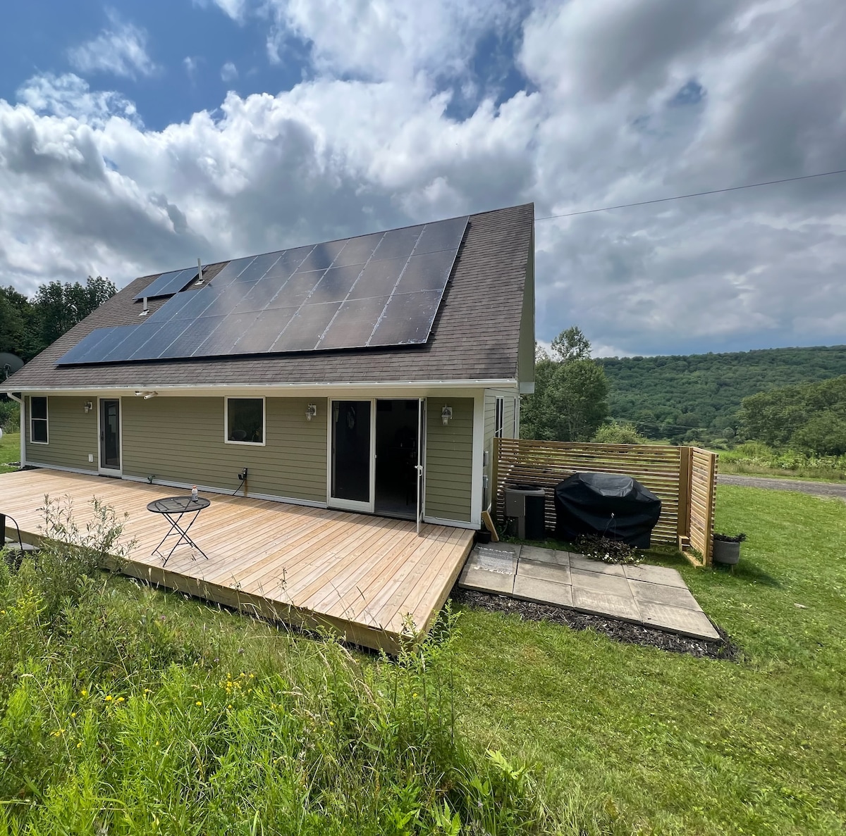 Charming open concept house nestled in the Catskill mountains 20 min E. of Oneonta. Exquisite Views! (**Adjacent to motorcycle racetrack. It's not visible, but noisy in daytime 9am-5pm 4-5 days/wk.) Enjoy a morning read in our comfy sofas and armchairs or get cozy by the gas fireplace at night. Explore our 20-acre property or relax out on the wide, sunny lawn. Outdoor table and chairs by the firepit are perfect for an evening meal overlooking the beautiful, ancient Catskill Mountains.