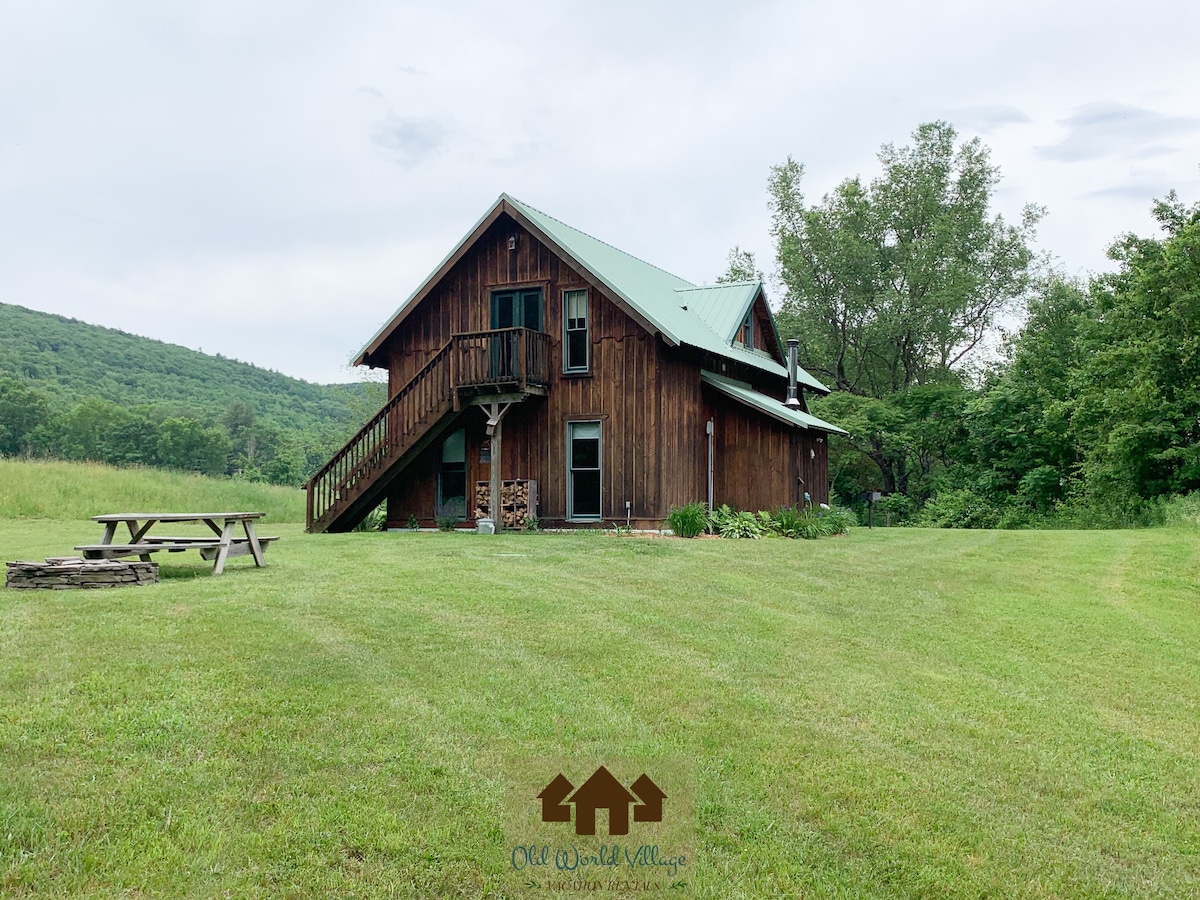 Cozy log cabin in the mountains located 5 mi from city of Oneonta & 25 miles to Cooperstown. Attractions include Cooperstown hall of fame, Cooperstown All StarVillage, Cooperstown Dream Park, Ommegang Brewery & golf. Family friendly atmosphere that includes a 3 bedroom house with kitchen amenities, a charcoal grill, and fire pit. The house has WiFi with a smart tv in each of the three bedrooms. Screened-in porch that overlooks a lake-sized pond.