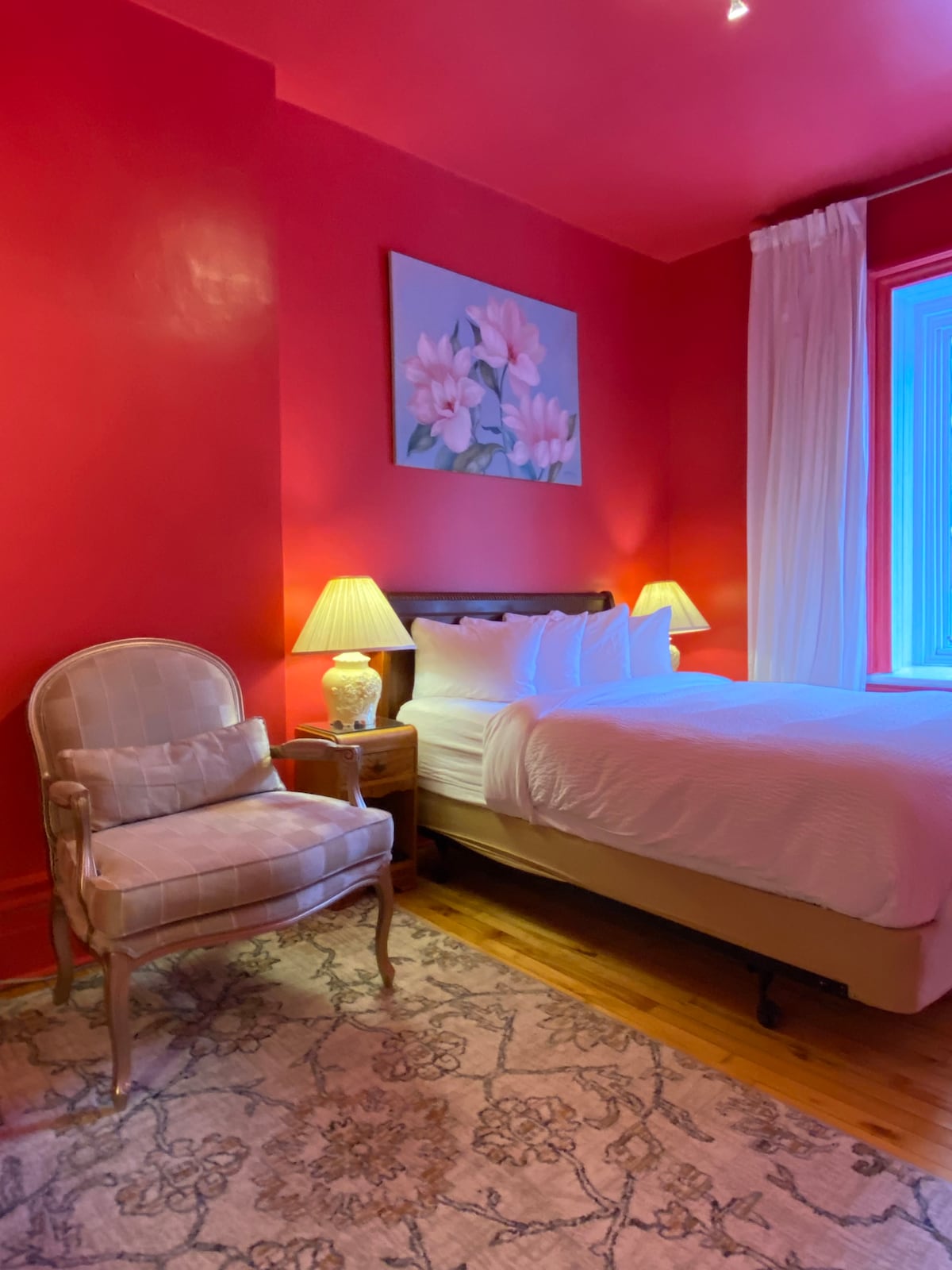 This stylish place is close to the Byward market, UofO./National Art Gallery/Parliament. The large room has 11’ ceilings + maple floors + private en-suite bathroom, queen bed, table and chair complete the space. This 2nd. floor room has an 8’ x4’ window overlooking the balcony at the front of the house. The room has a deadbolt and key, K-cup coffees and teas. We offer a 24 hr. Snack/breakfast station on the main floor. Includes fruit, yogurt, orange juice granola bars and popcorn.