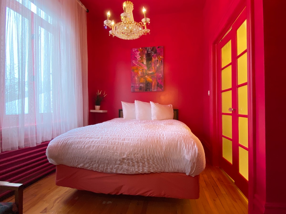This 1870 Victorian house is a downtown stylish place located in Sandy Hill. The room has an en-suite bathroom + queen bed. Close proximity to the Byward Market, parliament, UofOttawa and the National Art Gallery. The 2nd. floor room has 11’ceilings. There are coffees + teas, fresh towels + cotton linens. Neighborhood is mixed with residents, students + homeless. We offer a 24 hr. Snack/breakfast station on the main floor. Includes fruit, yogurt, orange juice granola bars and popcorn.
