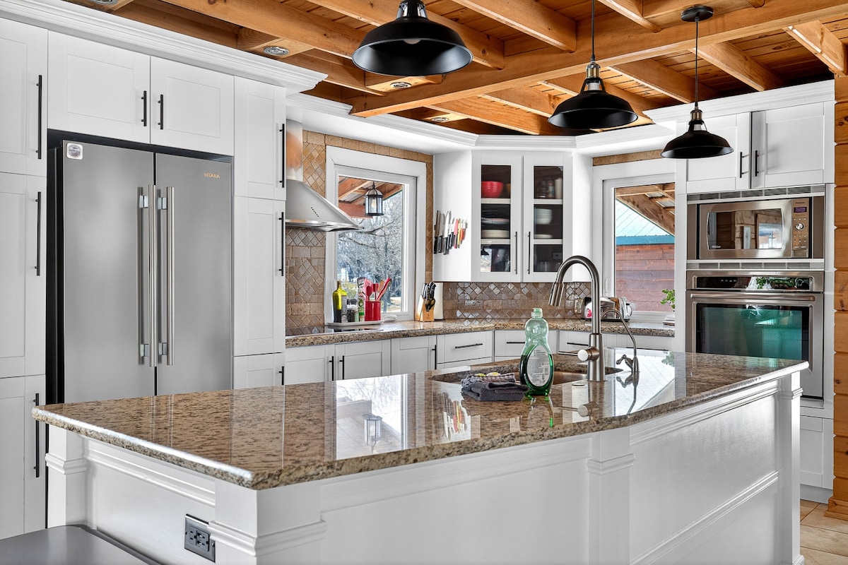 Escape to Chalet Buckingham, a stunning four-season retreat nestled on 3 acres of Ottawa River waterfront. Located just 45 minutes from Ottawa and 5 minutes from the Quyon ferry, this serene getaway is easily accessible and offers a peaceful escape from the city. Enjoy small boats and water toys in summer, cook in the large outdoor kitchen with BBQ + pizza oven, and unwind in the sheltered 8-person hot tub available year-round. Experience tranquility and adventure in one perfect destination.
