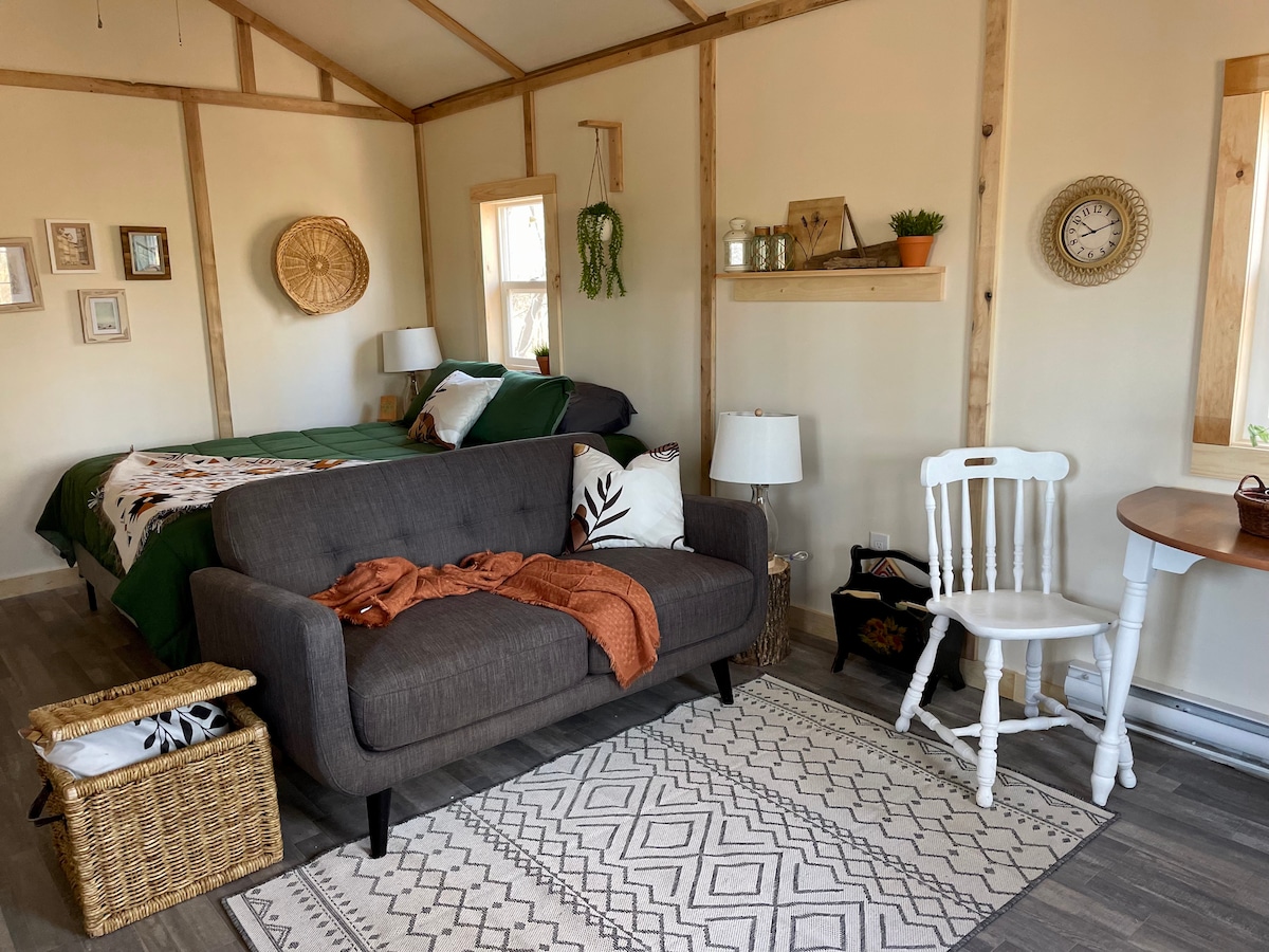 No cleaning fee A cozy tiny home tucked into the woods on our working farm — quiet, simple, and made for slowing down. Wake up surrounded by animals and nature, with everything you need for a comfortable stay: a queen bed, cozy sofa, kitchenette, dining table, and private toilet room, with access to a shared outdoor shower house. A peaceful farm stay to rest, reset, and enjoy a slower pace.