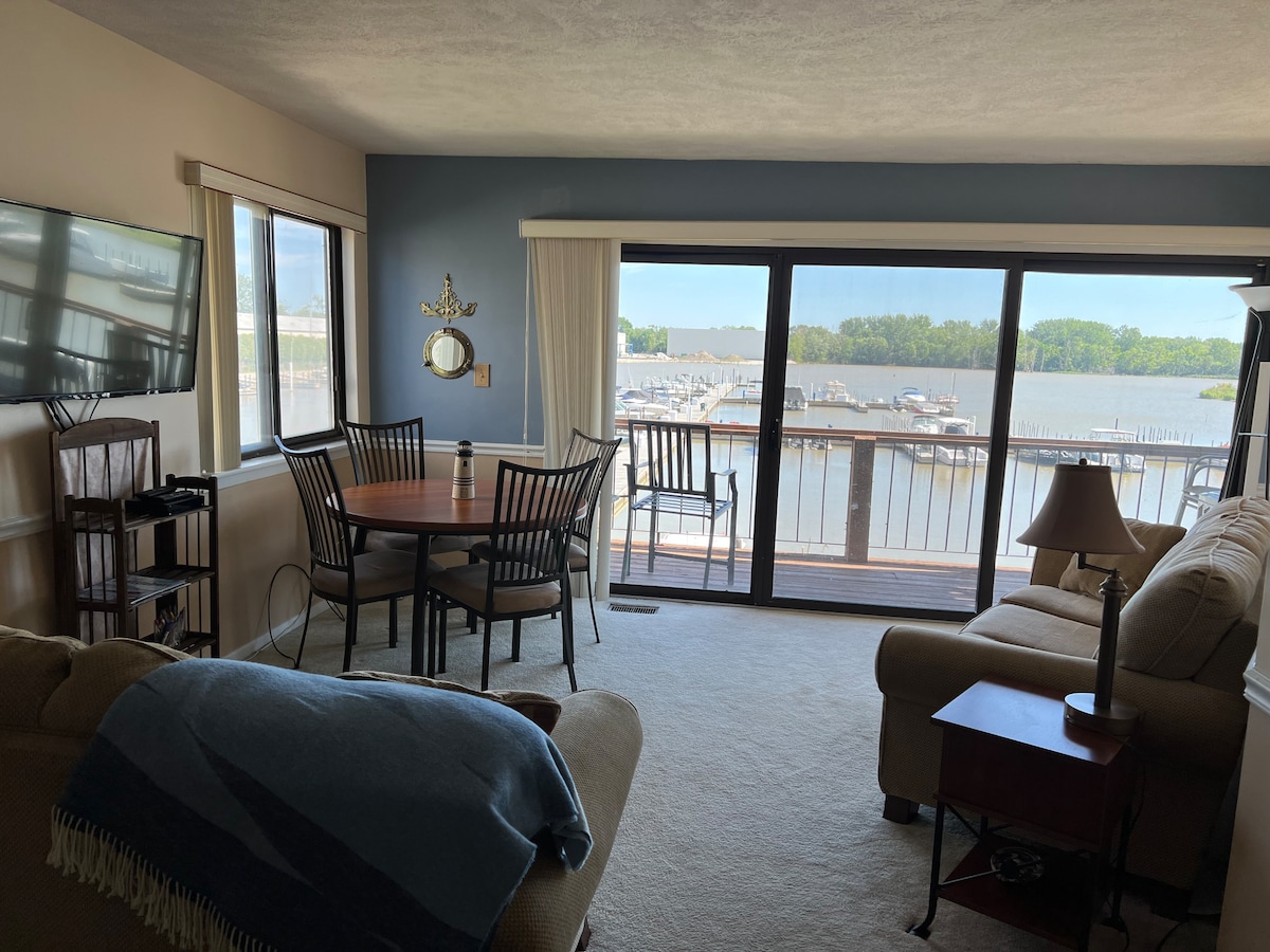 Cozy one bedroom one bath condo on third floor. Fabulous views of Lake Erie and Portage River from two balconies. Fully equipped kitchen and washer dryer. Clean, updated bathroom. Private wifi. Access to pool, hot tub and sauna. Close to jet express, downtown Port Clinton and other Lake Erie Shores and Islands sights. Comfortable queen bed. Living room has pull out sleeper sofa and additional couch and recliner. Perfect for birders, couples, singles or small families.