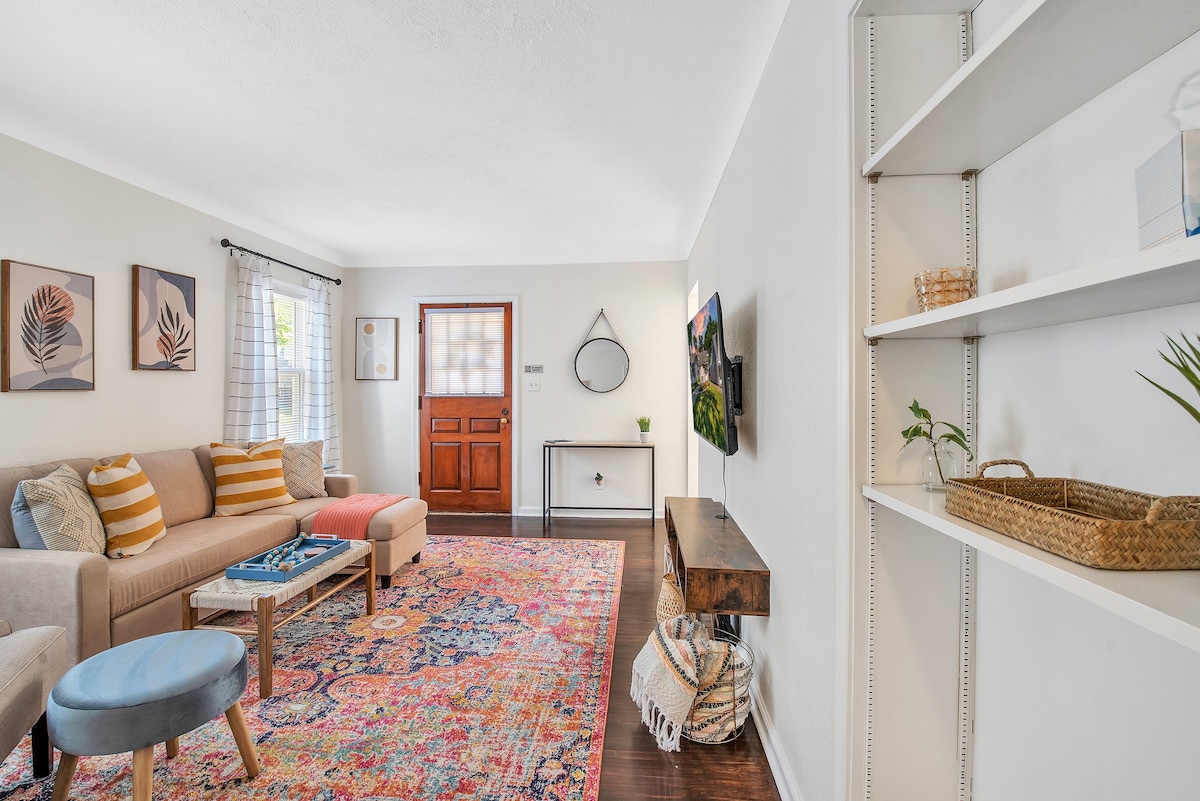 Kick back and relax in this serene 2bed home w/ remodeled kitchen, washer/dryer & Smart TV. This centrally located 1-story bungalow comes w/ Keurig Coffee, Speedy Fiber Wifi & dedicated work area, new memory foam beds (F & Q) cozy bedding & plenty of storage. Bringing young family or pets? Enjoy a large fenced in yard w/ plenty of green space. Love to cook? We've equipped the kitchen w/ a new stove & fridge, microwave, cooking utensils & guests will enjoy the 4 person dining area. Welcome!