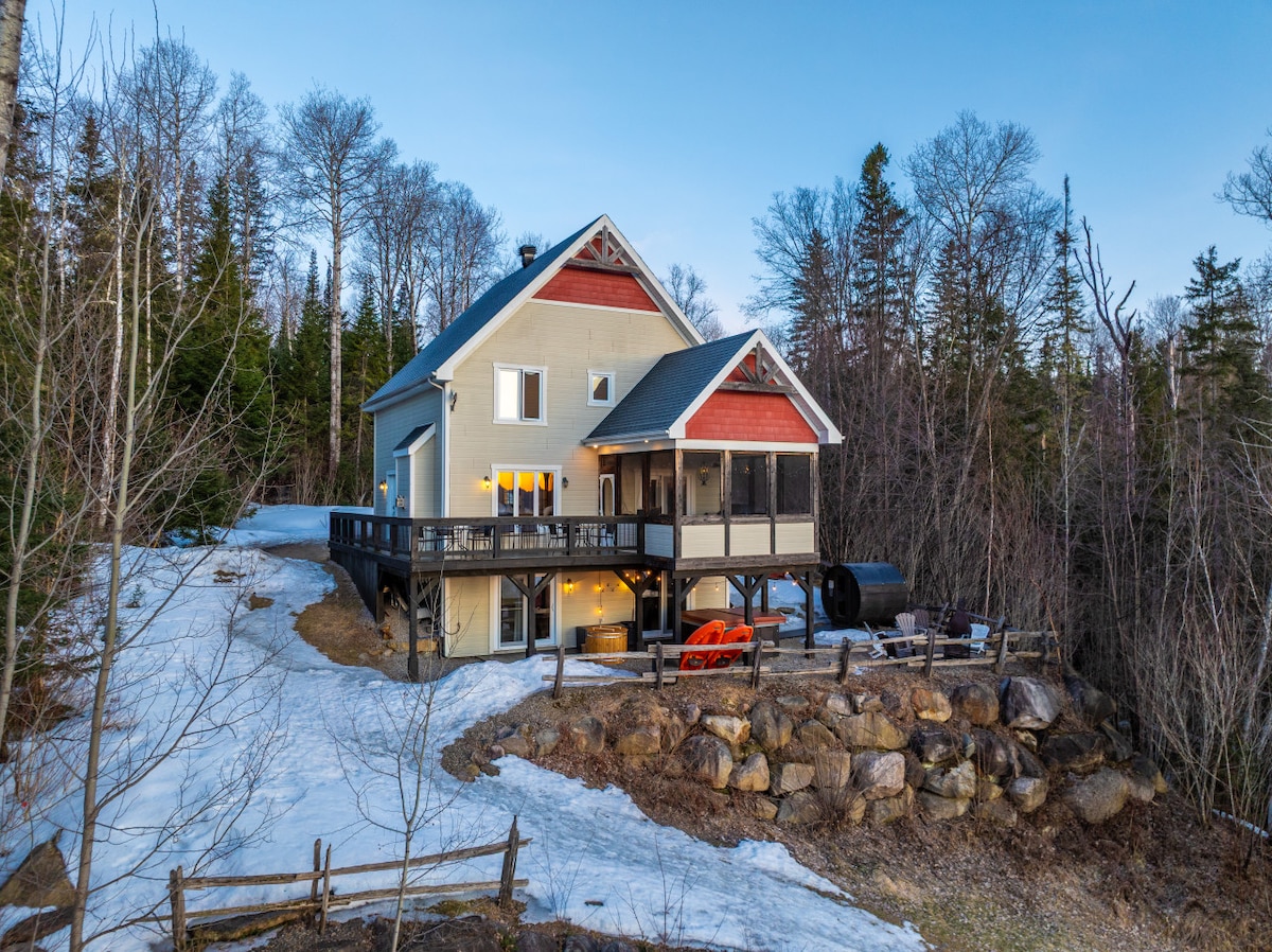 Unique haven of peace with breathtaking views! Located on a huge 100-acre estate with no nearby neighbors! Peace and tranquility guaranteed. Dogs accepted on condition until June 15. Dogs not allowed in high season. Cross-country skiing, snowshoeing and hiking trails on the doorstep. Spa with breathtaking views! In winter, a 4x4 vehicle is required to drive up the road to the chalet. THERE ARE CAMERAS ON THE PROPERTY Dogs welcome before June 15th + fees (no dogs in pick season). CITQ #30336