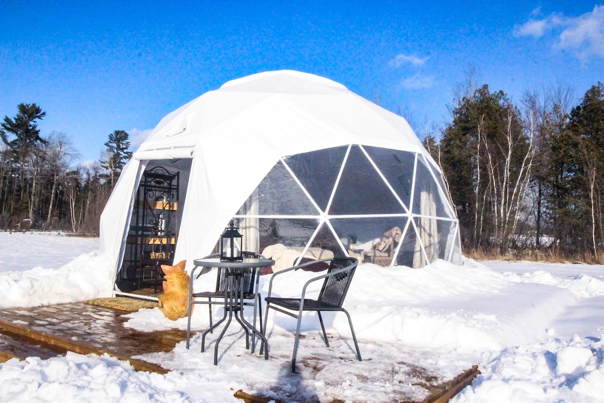 Tucked deep in a private forest, this four-season geo dome is your launchpad for off-grid adventure—without sacrificing comfort. After a day on nearby ATV or snowmobile trails, return to your stylish dome and relax under the stars through a stargazing skylight. Warm up by the wood stove, cook in the enclosed outdoor kitchen, and freshen up in the washroom—all designed to elevate your wilderness experience. Perfect for couples, solo adventurers, looking for a unique comfortable stay in Nature.