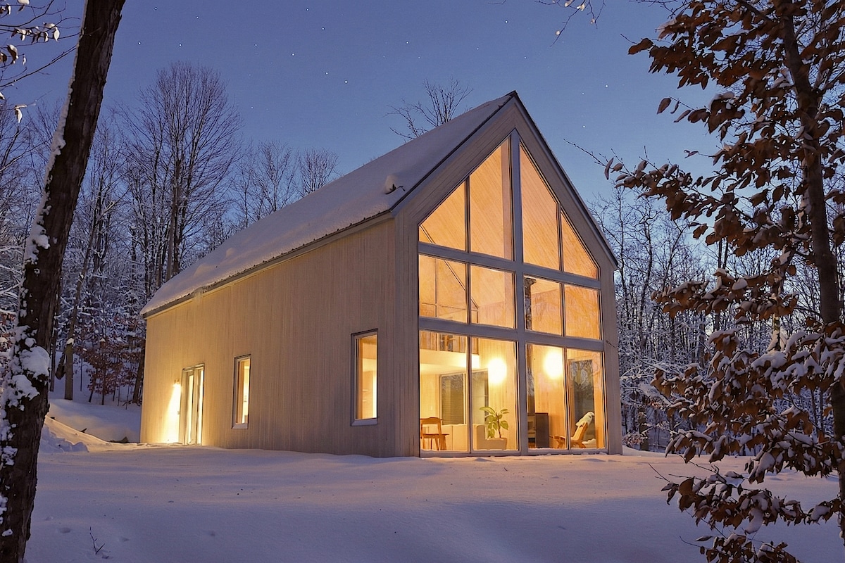 This forest chalet is an energy-efficient house on the private 10 acres hillside where the views are simply stunning. The architecture of the house is one of a kind with its exposed solid wood timber structure. Surrounded by the majestic beauty of the forest which gives you access to breathtaking ski slopes and splendid hiking trails only a few steps away. Enjoy ski at St. Sauveur and Mont-Tremblant and the chalet! ****Each guest must read additional rules before booking. ***