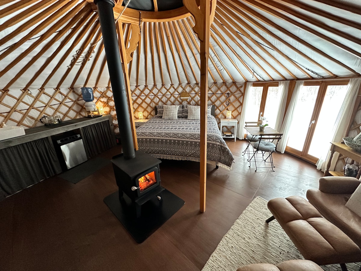 Reconnect with nature at Tall Pines Nature Retreats, where a luxurious hand-painted yurt with an indoor soaker tub offers comfort and calm in a forest sanctuary on a boutique horticultural farm. Stargaze by the fire, unwind beneath intricate ceiling art, or explore a magical riverside. Paddle, swim, or float with seasonal use of canoe, kayak, SUPs, or snowshoes. This is a registered agri-tourism farm offering a nature and wellness retreat—not a typical short-term rental.
