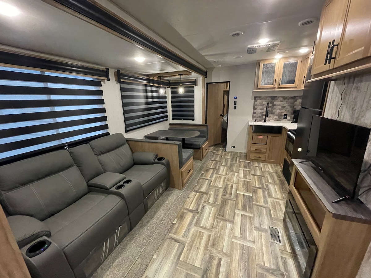 Welcome to Cooper’s Point, 10 min from downtown, feat a brand new private & adorable studio, 1 bath + cozy book nook Venture Sonic RV featuring gas range, deck w/hot tub & outdoor living spaces including grill, dining counter, & beverage fridge, all nestled under the pines & surrounded by water! Please note this RV has a murphy bed & small shower that might be difficult to use for some users. Our property is family owned&occupied with our cabins fenced off for pets & privacy. Se habla Español!