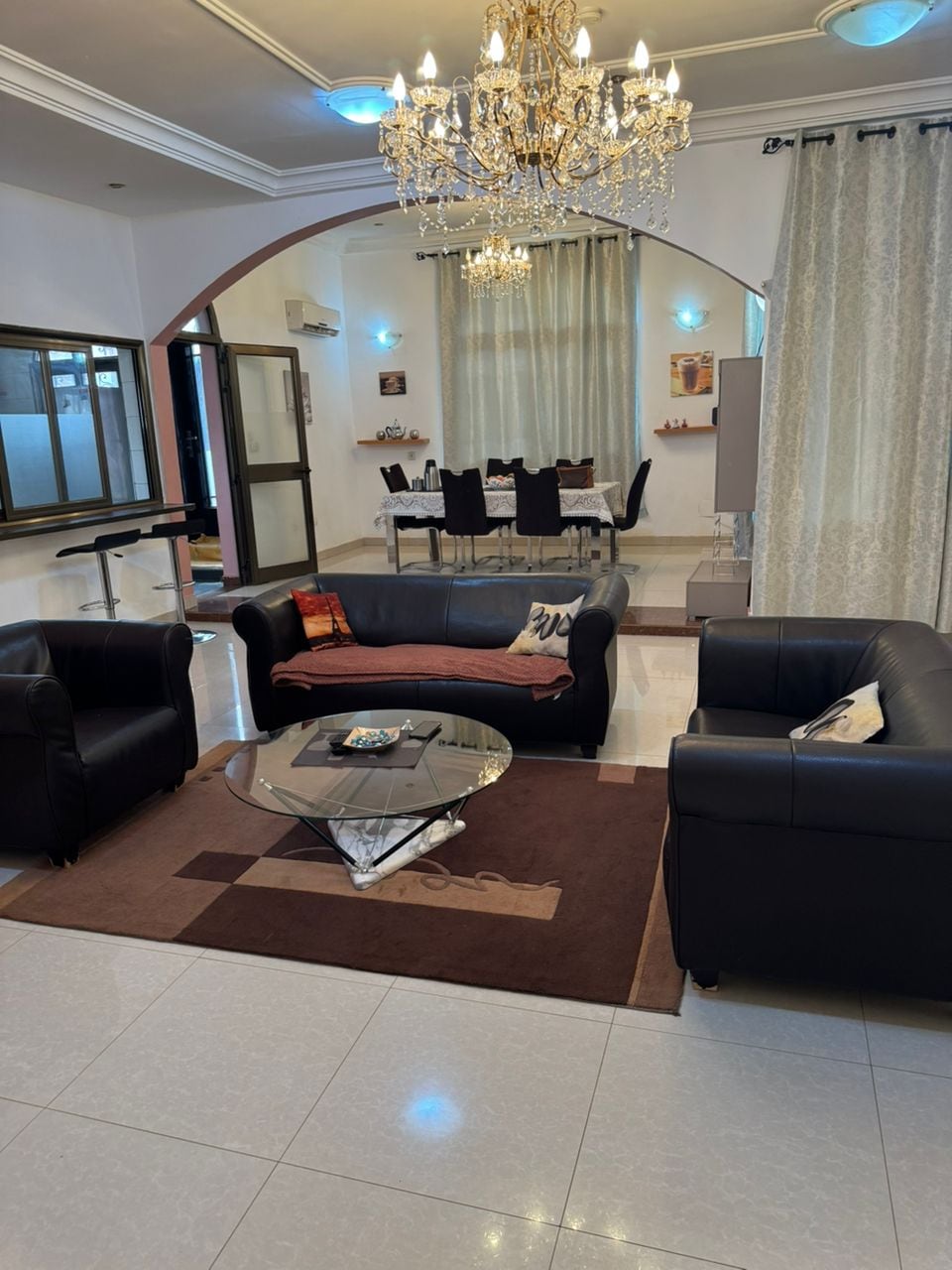 Notre 3 chambres salon situé à la cité Azimo Vous avez droit à une dame de ménage. un vigile pour votre confort et votre sécurité. De plus, vous pouvez profiter de la terrasse et de la machine de sport. De l'espace BBQ pour des moments de détente en famille ou entre amis. Notre jacuzzi (type spa ) est également à votre disposition pour des moments de relaxation. Polytank en cas de coupure d’eau disponible. Garage pouvant prendre deux véhicules. Wifi disponible, une personne Ps4 disponible