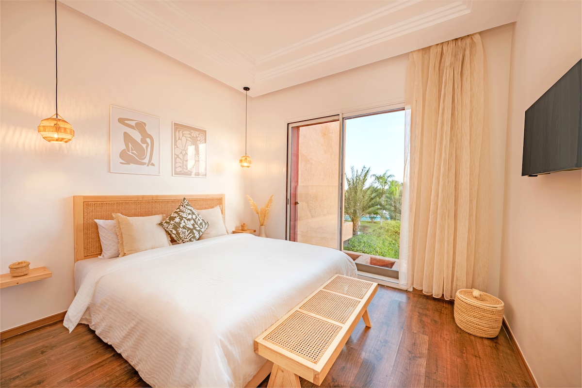 Appartement en RDC climatisé au cœur de la Palmeraie. Jardin & terrasses privées. Accès direct à la piscine. Cuisine ultra-équipée. Séjour chic, spacieux & lumineux. Smart-TV (chaînes mondiales + VOD) & wifi-fibre. Chambre 1: lit Queen-size. Chambre 2: lit convertible 2 pers. SDB élégante avec douche à l'italienne. Enfants: lit bébé, siège auto, jeux. Résidence privée & sécurisée 24h/24. Parking gratuit. Accès autonome. Bienvenue à Myraj Marrakech ! Marhaba! Laura & Boualam
