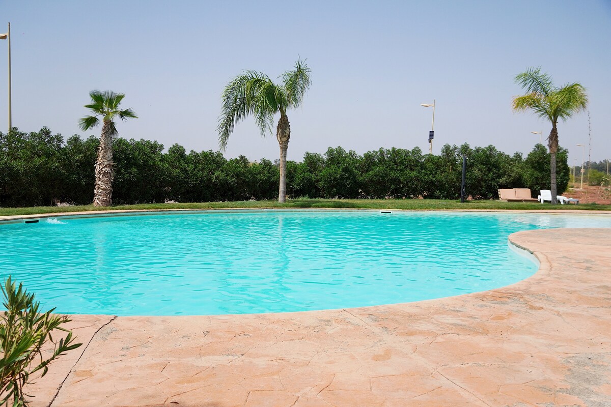Appartement cosy, ultra paisible situé à seulement 15 minutes en voiture du centre de Marrakech, situé dans une résidence sécurisée Idéal pour un séjour en couple, en famille ou entre amis. La résidence dispose d'une grande piscine accompagnée d'un snack avec possibilité de prendre son ptit déjeuner ou repas. En supplément, un chauffeur pourra être mis à disposition pour vous accueillir à l'aéroport et vous accompagner tout au long de votre séjour, nous proposons aussi la location de voiture