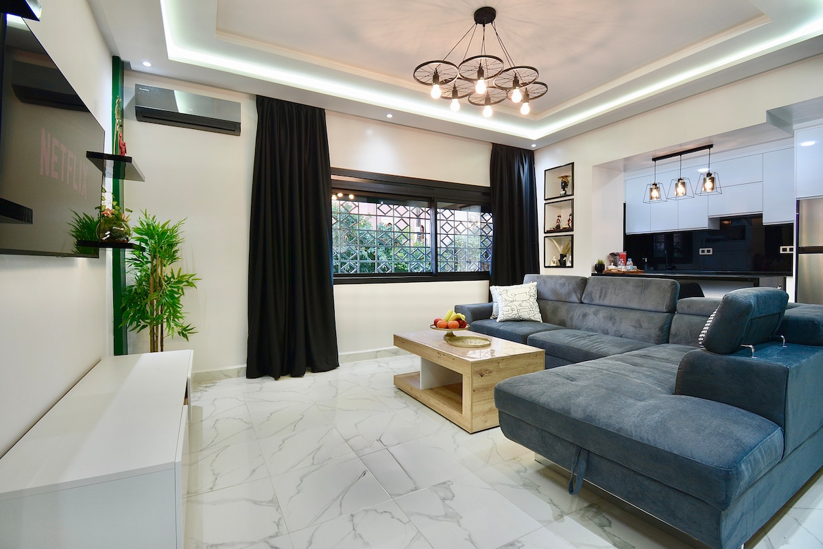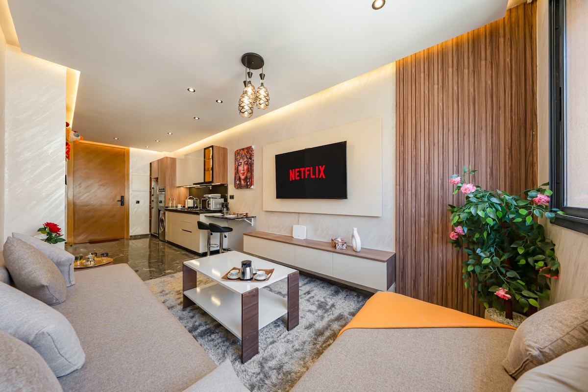 Un appartement élégant et neuf situé dans l'un des quartiers les plus sécurisés proche de toutes les commodités ( boucherie,épicerie, snacks et restaurants, à 2min de la faculté de médecine, et à deux pas de Guéliz (5min). * Doté d'un salon moderne luxueux. * Une TV 50" avec chaines satellite, Netflix, Youtube. * FIBRE OPTIQUE 100mbps. * Une cuisine entièrement équipée. * Une chambre spacieuse avec terrasse. * Climatisation centralisée. * Immeuble très propre avec parking sous sol privé.