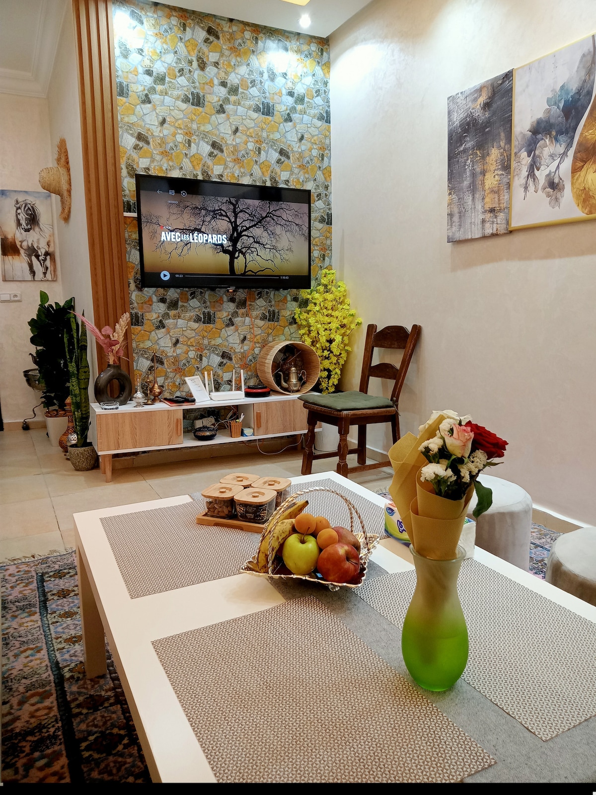 Bienvenue dans notre charmant appartement situé en plein centre de Marrakech. Le salon spacieux et la cuisine ouverte vous offrent un espace de détente convivial. Entièrement équipé pour votre séjour, vous trouverez tout ce dont vous avez besoin pour vous sentir comme chez vous. Profitez de la proximité des principaux sites touristiques et des commerces de la ville, tout en bénéficiant d'un cadre paisible et confortable. Les couples marocains non mariés ne sont pas acceptés.