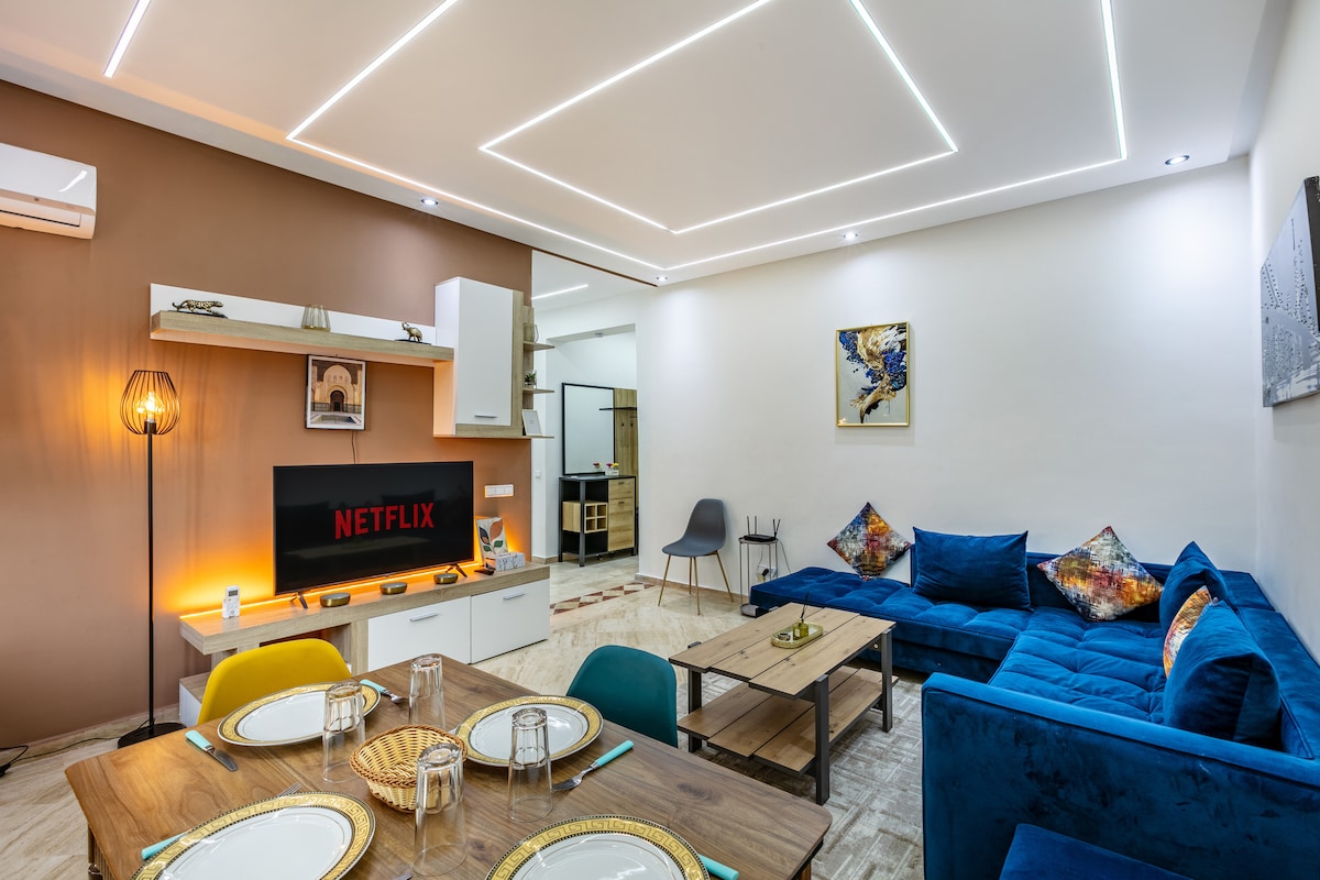 Appartement ensoleillé, chaleureux et hors pair, idéalement situé dans une résidence neuve en plein coeur du quartier mythique, Guéliz, avec une vue sur le Mall Carré Eden, très bien asservi et proche de toutes commodités. Moderne avec une touche marocaine, il est aménagé pour que vous vous sentiez chez vous, c'est le point de départ idéal pour profiter des merveilles de Marrakech ainsi que pour y séjourner pour un voyage d'affaire. Il est également parfaitement adéquat au télétravail.