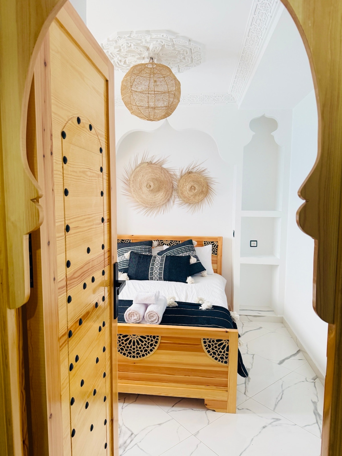Ideal for lovers or couples with a child, this royal room offers a magnificent view of the lagoon and the ocean, even from the bed, thanks to its 5 windows. It offers an equipped kitchen too, a patio with garden furniture and an upper terrace with view on the lagoon, equipped with sun loungers. The beach on the lagoon (near the hotel 5* Sultana) is 9 to 10 minutes walk. The main beach of Oualidia 5 minutes by car