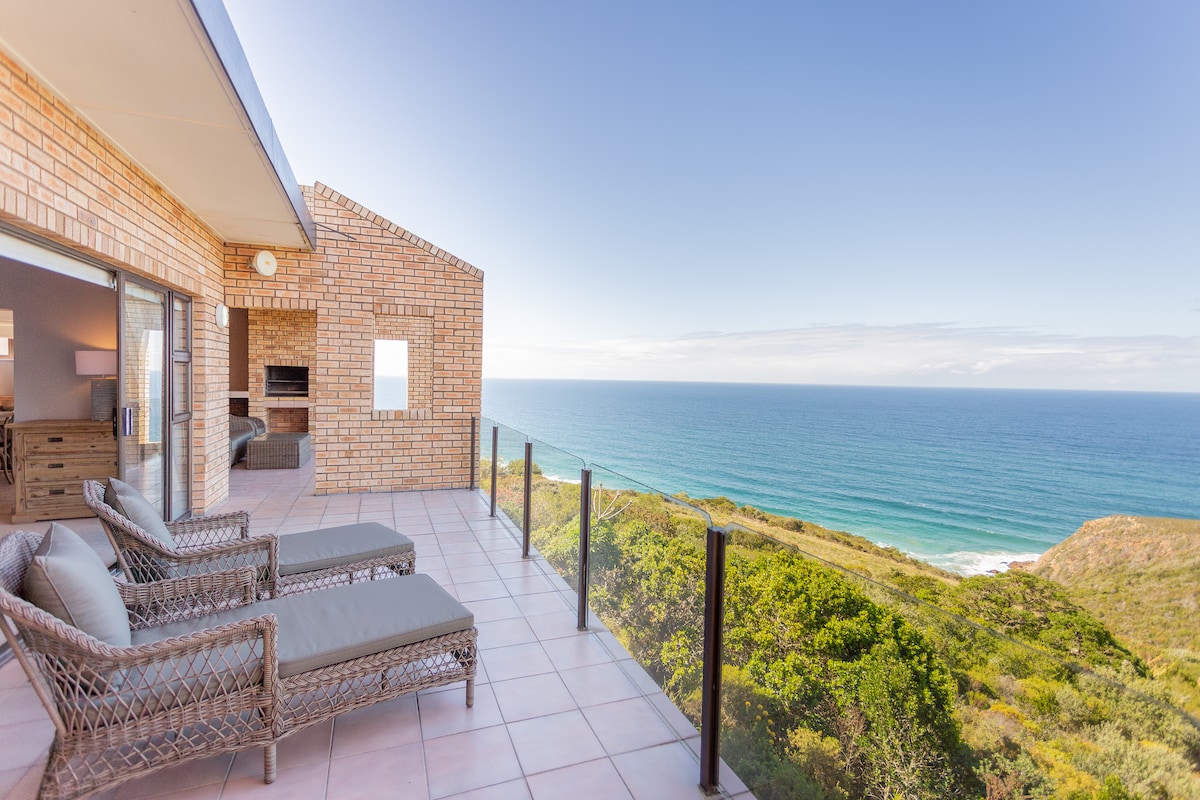 Backup power supply. 4.4m x 2.4m heated pool. The house is set in a dramatic location perched 60m above the ocean, with endless ocean views. Set in a 94 hectare private , safe reserve, walks and hikes from the front door, come and experience nature in luxury. Whales/Dolphins/wildlife/ stars! 24 hour security 15 minutes to George Mall, 20km from George Airport. The house has 180 degree views over the Ocean, with fresh clean air and the sound of the ocean below.