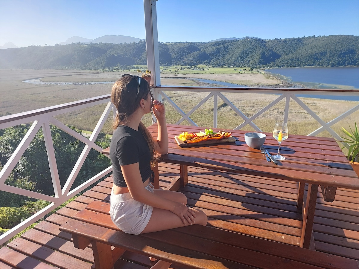 Eve's beautiful cottage in Eden, sits at the top of the Wilderness hills with panoramic, uninterrupted views over Island lake and the Serpentine River and Outeniqua mountains. Very easy to access, and conveniently situated right on the N2 (national highway). Surrounded by pristine beaches, nature reserves, hiking trails, and countless adventure activities.