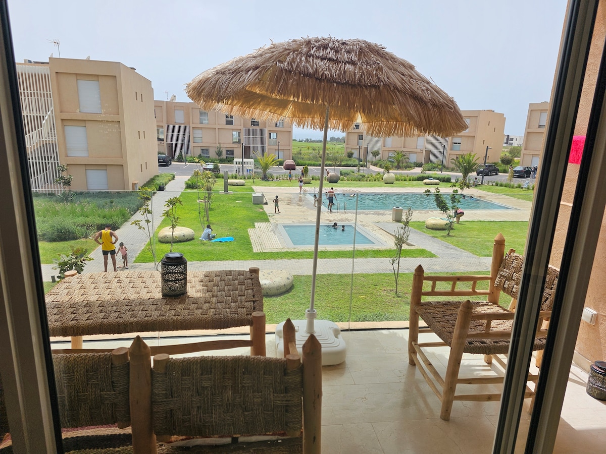 Ce logement paisible et chaleureux vous offre un séjour détente dans une résidence touristique sécurisé où vous pouvez trouvé tous ce que vous aurez besoin piscine, plage, jardin, restaurant, sandwicheries, épicerie, location de voiture, salon de coiffure... la résidence se trouve dans le village aourir de 10min par voiture à Agadir et 2km à taghazout. c'est un endroit préférables pour les surfeurs l' ensoleillement au lit grâce aux baies vitrées du terrasse climat printemps éternel