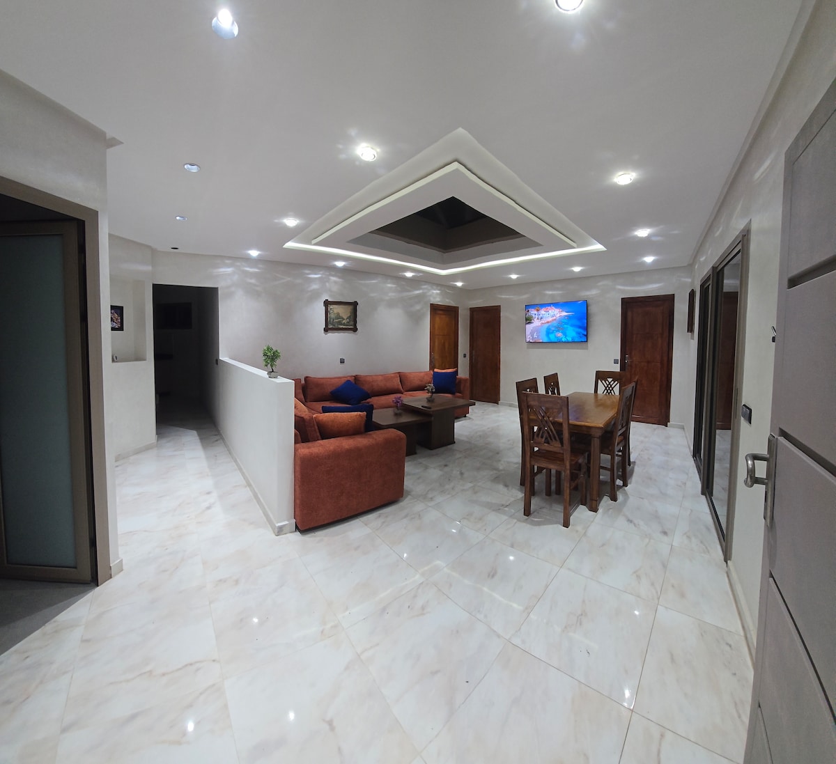 Offrez-vous un régal en séjournant dans cet appartement lumineux et moderne ! Tout est confortable dans cet appartement, les œuvres d'art et le décor en dit long sur la beauté ! Vous et votre famille ou vos amis pouvez profiter l'un et l'autre sans vous sentir à l'étroit ! si vous respirer de l'air frais tout en dégustant une tasse café/Thé pendant la journée tout en profitant de la vue paisible que cet appartement a à offrir. c'est votre maison loin de chez vous lorsque vous explorez Agadir.