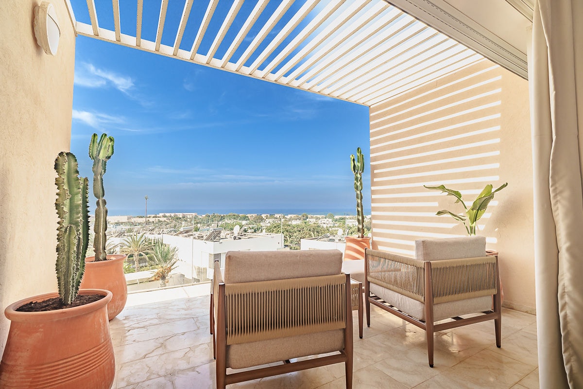 Luxurious penthouse with panoramic views of the Atlantic Ocean in the heart of Taghazout. Unique and sophisticated house, with attention to detail, from fine materials to designer furniture. The house has 4 bedrooms, two with double beds, one with en suite bathroom, a bedroom with two single beds and a spacious single room. Large living room with windows overlooking the ocean, an equipped kitchen overlooking the sea and a terrace with sofas, dining table and Barbeque. Hotel service on request.