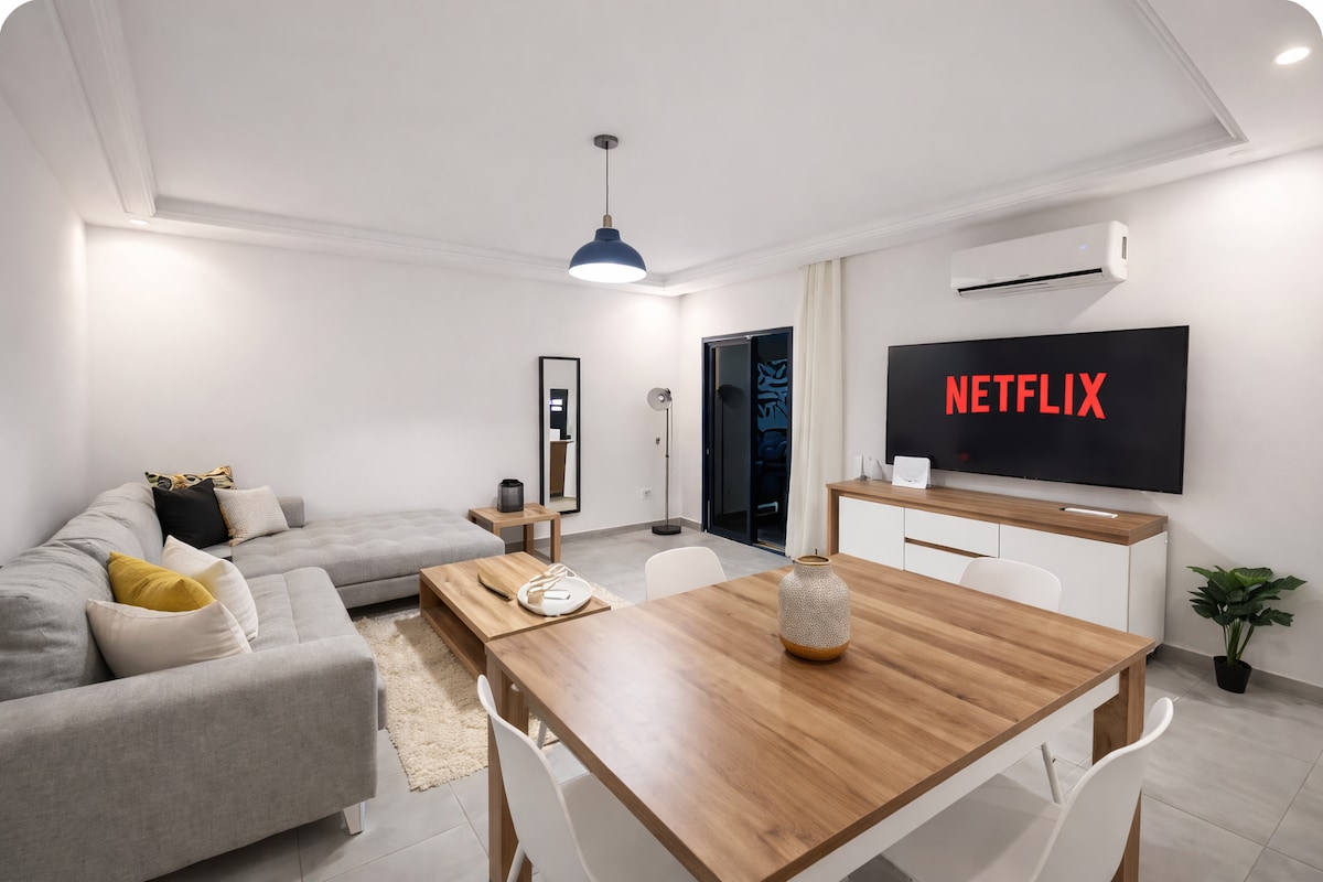 🏟️ CAN 2025 ⚽️ , à presque une heure du grand stade IBN BATOUTA ,venez découvrir cet événement exceptionnel 🔥. 📍 Appartement 🏡 202 rez-de-jardin 🪴, vue sur piscine,immeuble calme avec ascenseur. 🏖️ À 4 min 🚙 de la plage de Martil. ✈️ À 9 min 🚙 de l’aéroport Sania R’mel de Tetouan. Un écrin de douceur niché dans le quartier des Facultés . Ici, chaque détail a été pensé pour vous offrir un mélange de calme et d’élégance.