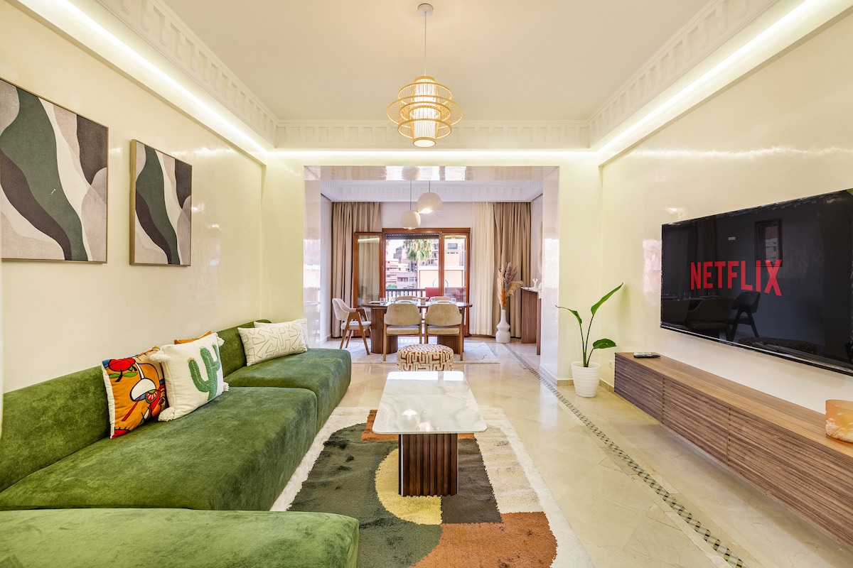 平均评分 5 分(满分 5 分),共 8 条评价Gueliz 2卧室公寓泳池,靠近马约雷尔花园