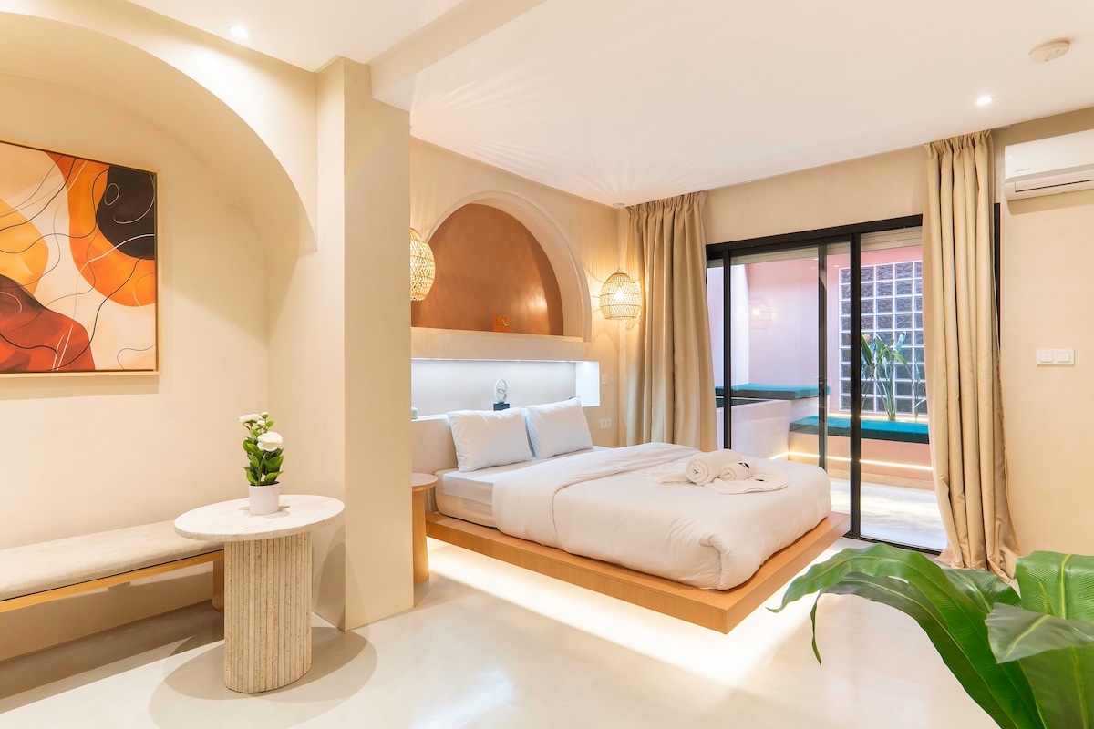 Bienvenue dans votre oasis privée au cœur de Marrakech un studio à l’inspiration tropicale, conçu autour d’un concept pur et apaisant. Ici, chaque détail invite à la détente, entre nature, lumière et confort moderne •le petit bassin privé en plein air pour un moment de bien-être • Douche extérieure rafraîchissante, ambiance naturelle • Terrasse tropicale idéale pour se détendre ou partager un repas • Décoration soignée aux tons naturels et matériaux.