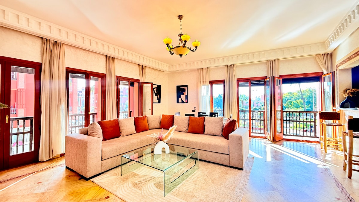 Expérience immersive dans un appartement-galerie contemporaine. Parfaitement situé dans le Triangle d’Or festif, 15 min à pied de la médina. Cet appartement très haut de gamme de 140m2 lumineux et cosy. À deux pas des palaces emblématiques (Mamounia, Sofitel, Casino) Résidence de prestige avec piscine. Idéal jusqu'a 5 voyageurs, il offre 2 chambres, 3 terrasses, 2 salles de bain et 3 WC. Entre ambiance branchée et animée, une expérience unique au cœur de Marrakech vous attend.