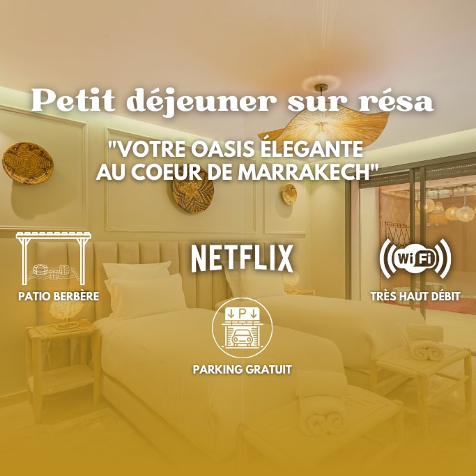 Séjournez en plein cœur de Marrakech dans notre appartement 2 chambres et 2 salles de bain. Profitez d'Une literie Simmons haut de gamme, WiFi haut débit (fibre optique) et d'une décoration moderne avec un bassin privé. Cuisine entièrement équipée, baignoire élégante, et douche italienne. À quelques pas de la place Jemaa el-Fna, du Plazza, et du Carré Eden. La piscine n’est pas chauffée. NB: Les couples marocains non mariés ne sont pas autorisés.