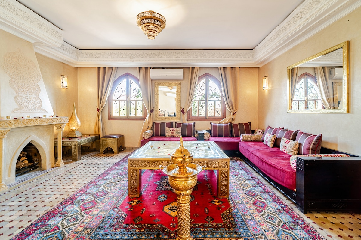 Experience our chic, luxurious riad in Marrakech, blending traditional elegance with modern comfort. The ground floor has a dining area, library, sofas, chill-out courtyard, and full kitchen. Upstairs, two bedrooms with private bathrooms. Rooftop terrace with water basin, sun loungers, fireplace, and stunning Atlas views. Perfect for a romantic, memorable getaway.