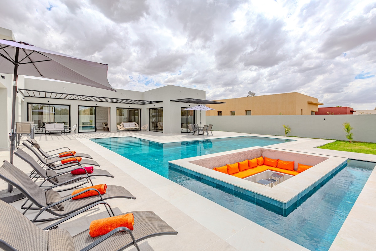Villa située à 30 minutes de Gueliz dans un charmant domaine sécurisé 24/7 avec terrain de tennis commun et piscine privée. La villa se compose de 3 tres grandes suites avec chacune leur cheminée, leur télé (Netflix gratuit), 3 salles de bain, d'une petite piscine intérieure chauffée, d'une piscine extérieure privative et d'un jardin privatif sans vis à vis, d'un salon avec cheminée. Table à manger convertible en billard et en table de ping-pong. Idéal pour se détendre au calme.