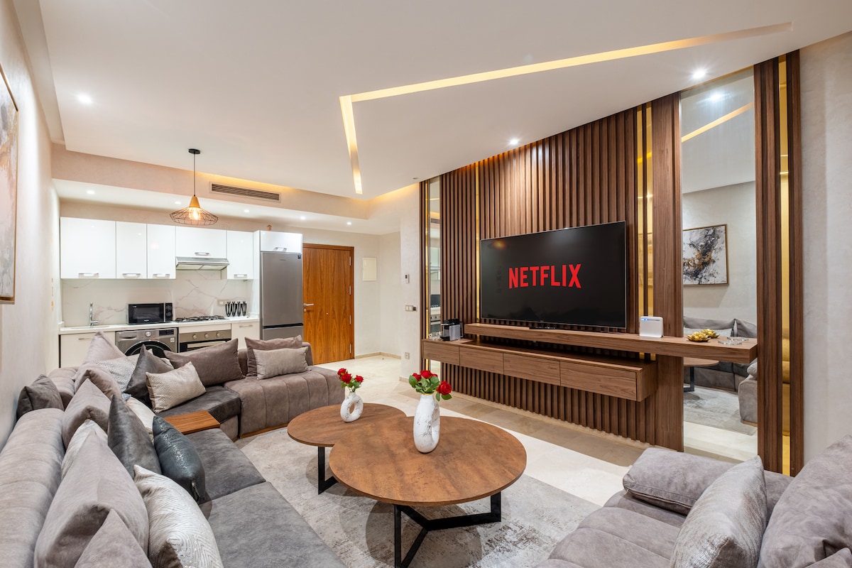 Superbe Appartement à louer par nuitée (la résidence Pearl Garden Marrakech bénéficie d'un emplacement central. Tout ce dont votre famille a besoin est à portée de main.) À 5 minutes à pied se trouvent le supermarché Marjanne, un McDonald's et un Pizza Hut. Le parc Palooza est également à proximité pour le plus grand plaisir des enfants.