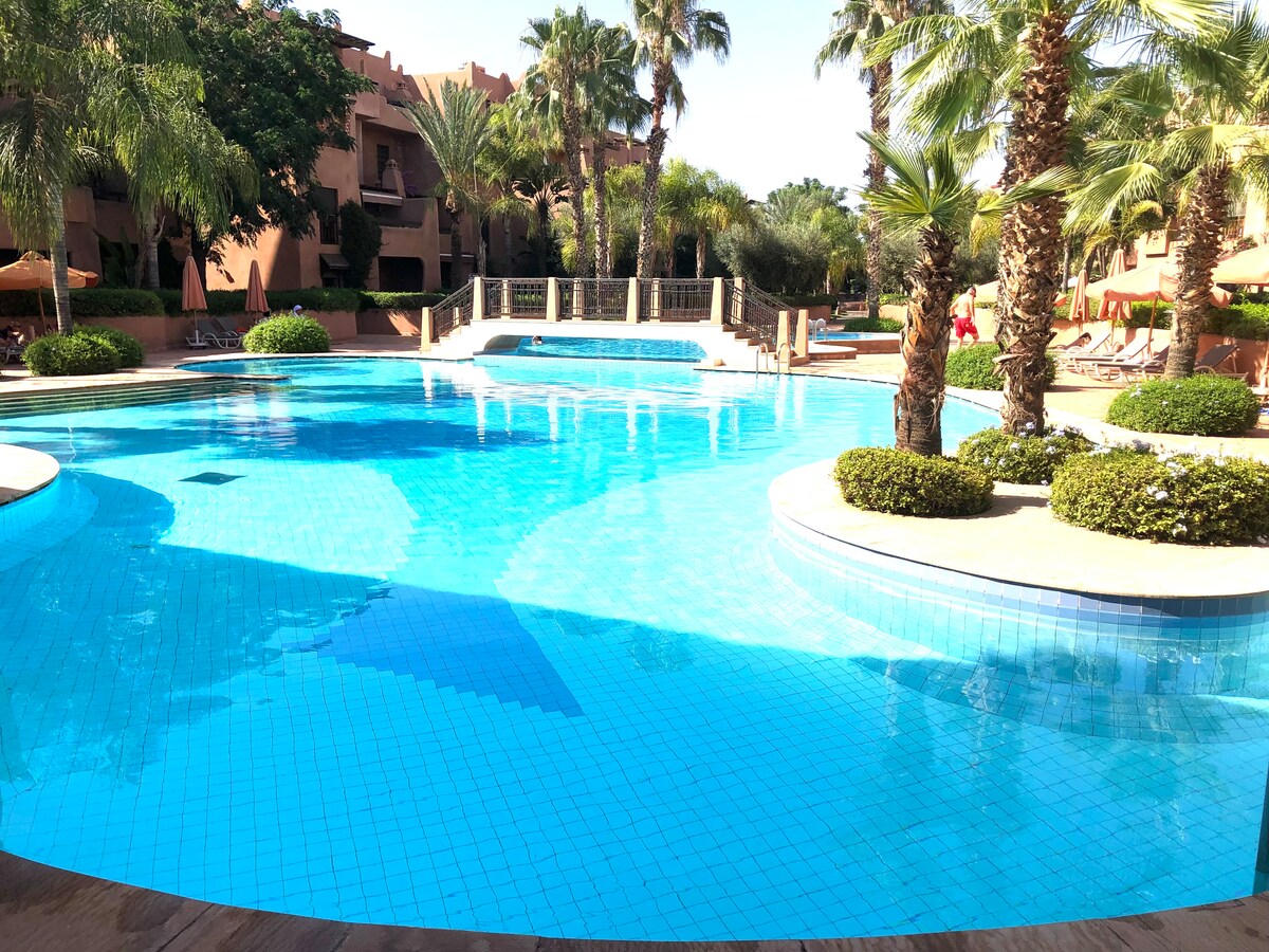 Bel Appt dans une résidence luxueuse fermée et sécurisée avec piscine et jardin privatif, situé à 5 mn en voiture et à 20 mn à pied de la Koutoubia et de la Médina. Centre commercial Al Mazar et Carrefour à 7 mn à pied. Abonnement gratuit NETFLIX et toutes les chaînes TV disponibles sur IPTV. Possibilité de disposer d’une femme de ménage/cuisinière à la demande à petit prix.