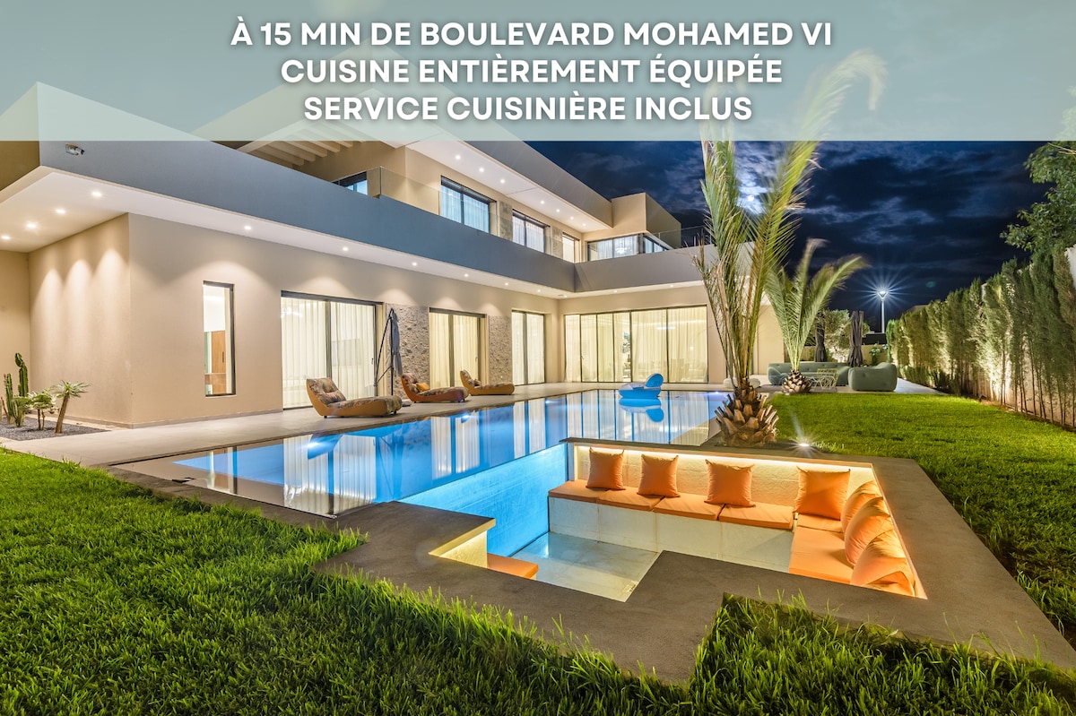 Privatisation complète jusqu’à 22 pers. Villa de luxe sans vis à vis, avec grande piscine chauffée à débordement & jacuzzi. 6 grandes suites climatisées & chauffées avec TV, minibar, café, etc... Idéale pour séjours & petits événements : avec danseuses orientales, musiciens, cracheur de feu & +. Services premium : ménage quotidien, serveurs, majordome. Billard, Mini-foot, basket, ping-pong... Coach sportif. Excellente cuisine marocaine. Transfert aéroport offert (1 vol). Tous transports 24/24