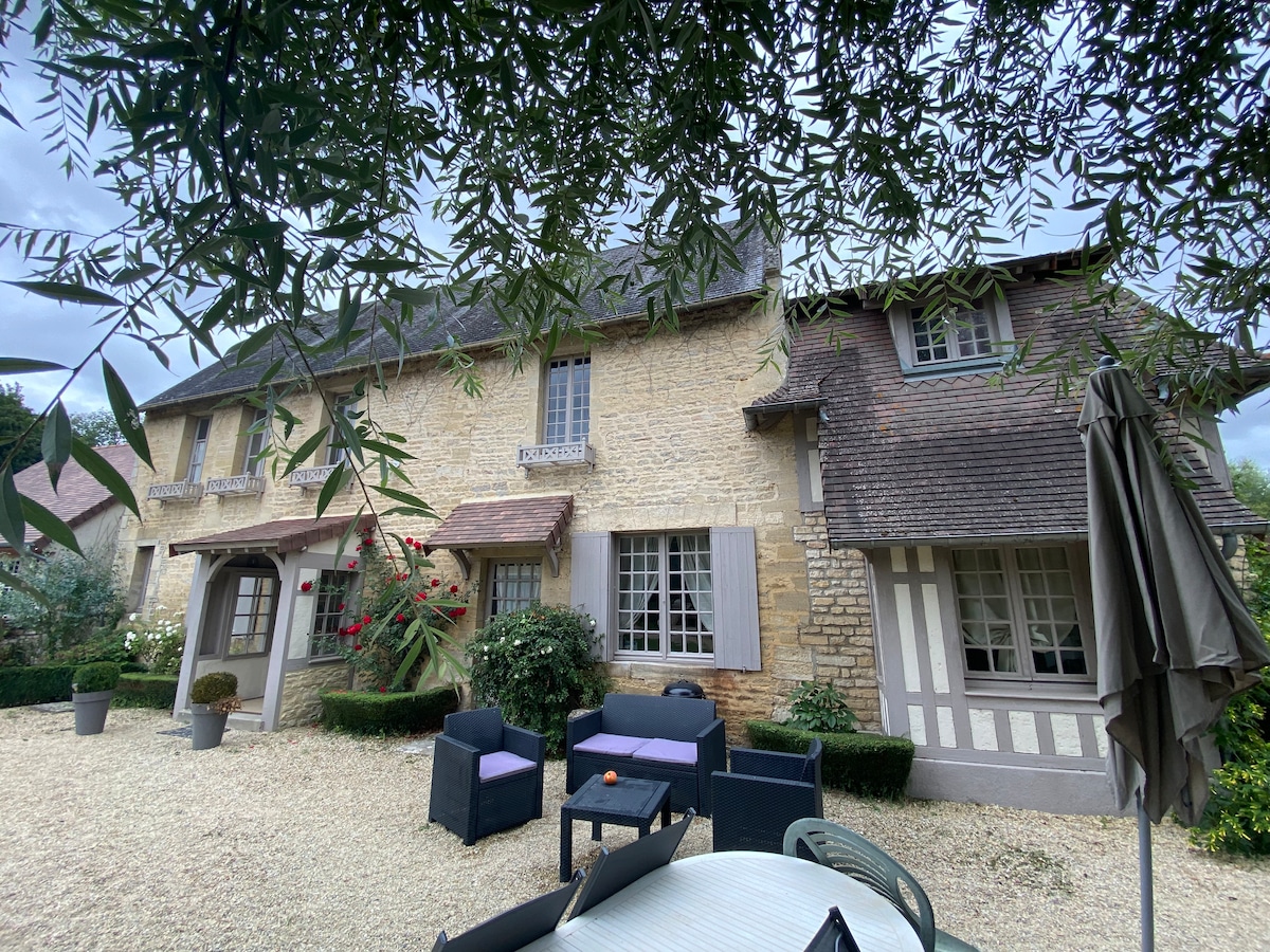 Maison de famille normande à colombages, spacieuse, accueillante, chaleureuse, dans un nid de verdure, et longée d'un petit ruisseau au centre du pays d'Auge. Grand terrain de 8000m2 clos et arboré, entouré de pâturages, parfait pour les enfants. Mobiliers et couchages de qualité. Toute équipée électroménager, Wifi et bouquet TV. La maison a été classée "meublé de tourisme" 5 étoiles. Les draps , les serviettes sont fournies venez uniquement avec vos affaires personnelles.
