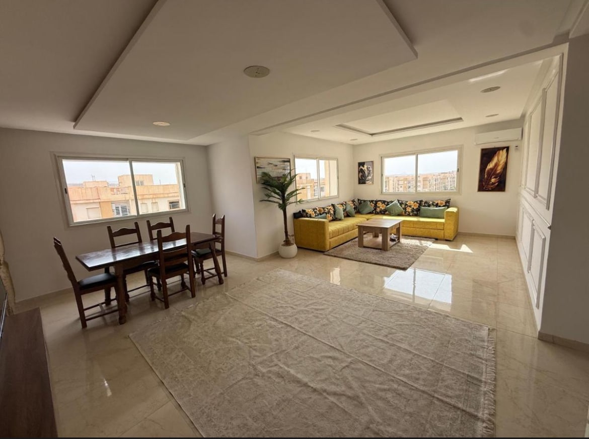 - Appartement entièrement meublé et équipé d'une superficie de 95 m2 de haut standing. - Position idéale : en plein cœur du nouveau centre d'Oujda, à proximité de CHU, Wilaya et nouvelle Commissariat, accessibles en bas de l'immeuble des taxi et café. - Logement neuf : cuisine entièrement équipée, IPTV & Netflix, Internet, Machine à café, climatisation... - Immeuble résidentiel tranquille, avec une place de stationnement gratuit en sous sol .