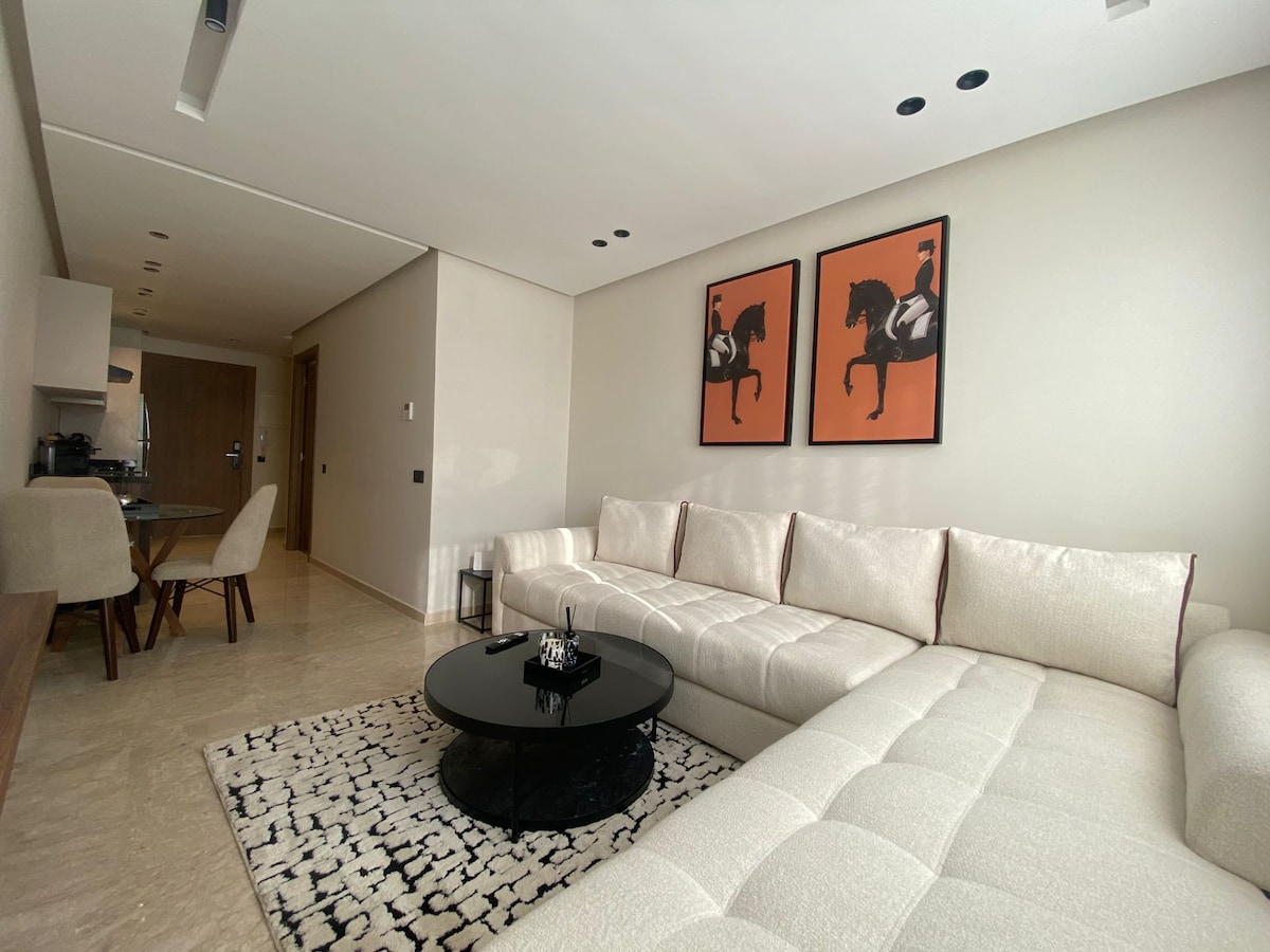 Welcome to this luxurious 1bedroom in the heart of Casablanca Finance City. Enjoy a future infinity pool, gym, and sun loungers. The studio offers a stylish living room equipped with a TV, a fully equipped kitchen, and a modern bathroom with a walk-in shower. Ideal for a refined stay in one of Casablanca's most prestigious neighborhoods. Front of Busway and Tramway 100m from Aeria Mall and Anfa Park.
