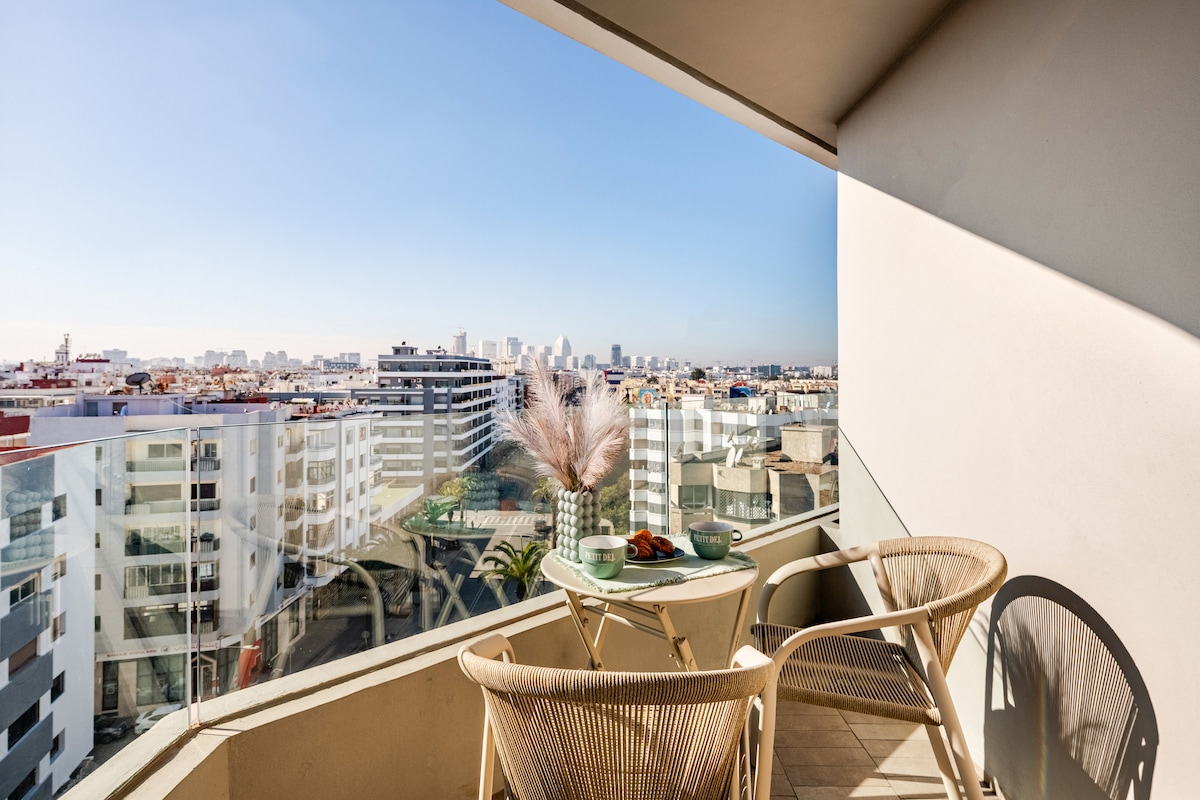 Elevate your stay in this 50sqm boutique studio, where authentic Moroccan warmth meets a breathtaking horizon. Located on the 9th floor with a West-facing orientation, you will enjoy unobstructed views of the Anfa hills and the Atlantic Ocean—the perfect front-row seat for Casablanca’s golden sunsets. We prioritize your comfort with high-end bedding, premium linens, and a cozy, soulful interior design that feels like home.
