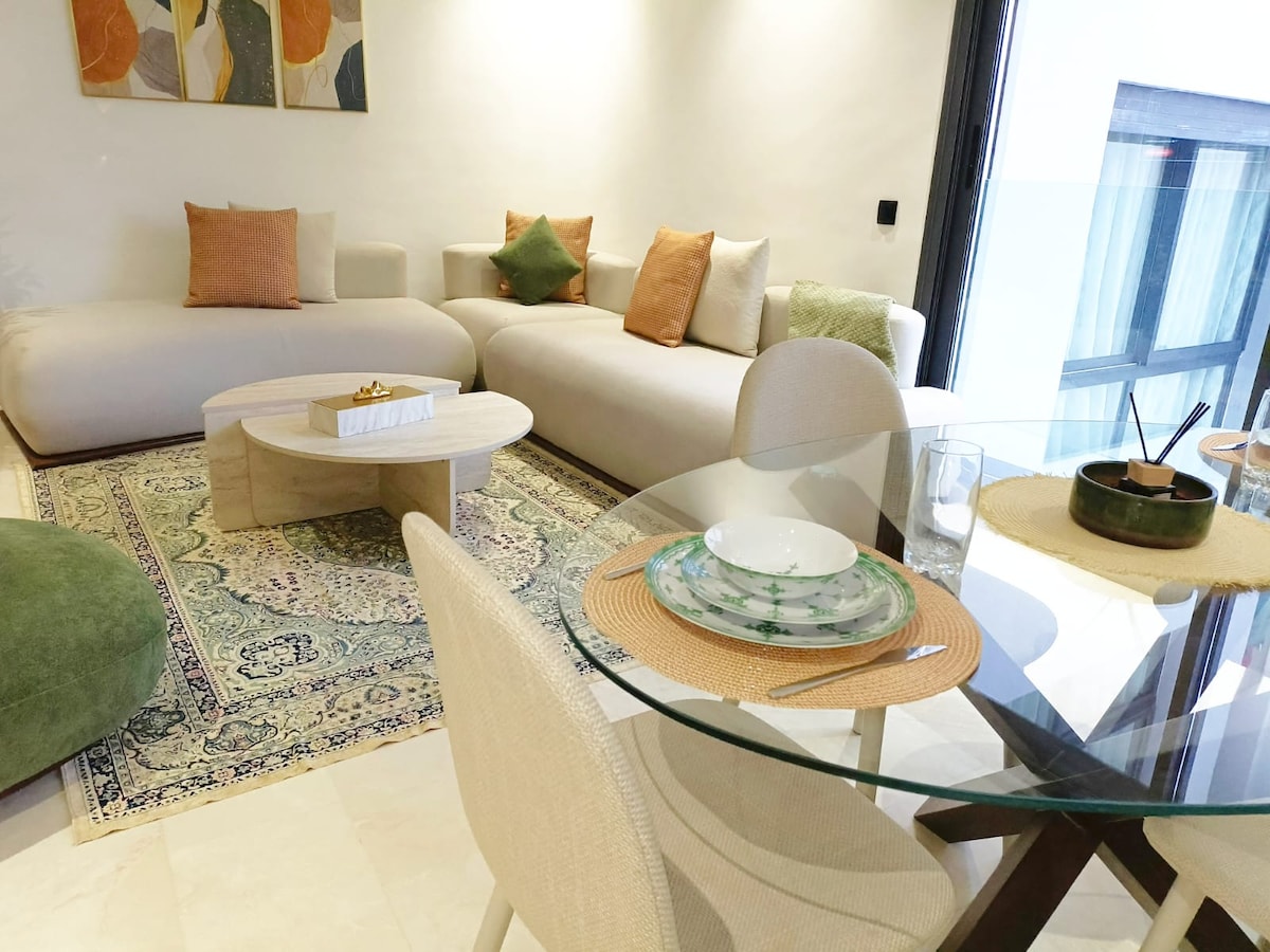 Perla 403 💎 , un havre de paix où l'élégance d'une résidence moderne s'allie au confort des hôtels 5* en plein cœur de Casablanca ! Relaxez-vous dans un salon spacieux au design moderne, équipé d'une Smart TV 55’ avec Netflix et IPTV pour des soirées de détente absolue. La chambre, véritable nid douillet, vous promet des nuits paisibles et réparatrices ☁️ Depuis votre balcon privé, admirez les splendides couchers de soleil sur la ville, rendant chaque moment de votre séjour inoubliable ! ✨
