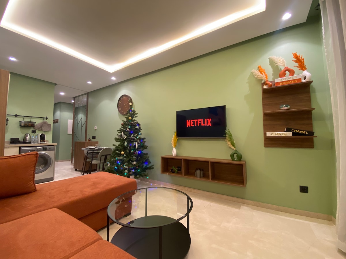 Looking for a cozy last-minute stay or a relaxing day in Casablanca ? Our stylish apartment in CFC -the city’s most exclusive district- offers two themed terraces, perfect for chilling, dining, or hosting friends. Enjoy a floating Queen-size bed, Netflix projector in your bedroom, fully equipped kitchen, and comfy living room. Aeria Mall is right across the street, and you can walk to luxury cafés and fine restaurants nearby. 24/7 self check-in for total freedom !