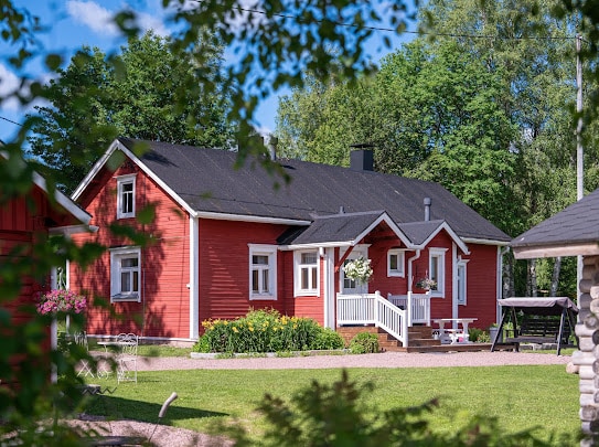 Welcome to relax and enjoy nature’s beauty in the peaceful retro home. The landscape changes by the four seasons: in winter the house is surrounded by snow, in spring the flowers appear, in summer the greenery and berries, and in autumn the leaves turn colourful. The house is between a river and forest. It is decorated in light and blue colours; sunny yellow dishes add a colorful touch. The large living room windows open to the south, and the sun shines on the yard and porch all day long.