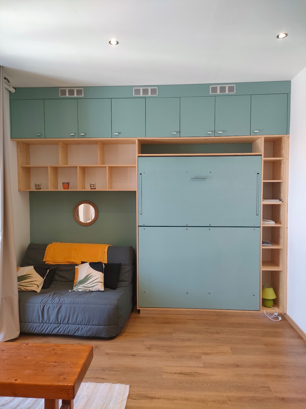 Appartement de 28 m2 entièrement rénové au 1er étage de notre maison dans quartier calme avec terrasse de 18 m² exposée sud, vue dégagée sur les montagnes. 1 pièce avec coin cuisine équipé, salon avec tv, wifi, canapé convertible, 1 chambre avec un lit double (140x190cm) et deux lits superposés (90x190cm). 1 salle de bain avec douche et wc. Logement idéal pour 2, possible jusqu’à 4 personnes. Stationnement sur parking privé. A 900 m du centre ville et gare.