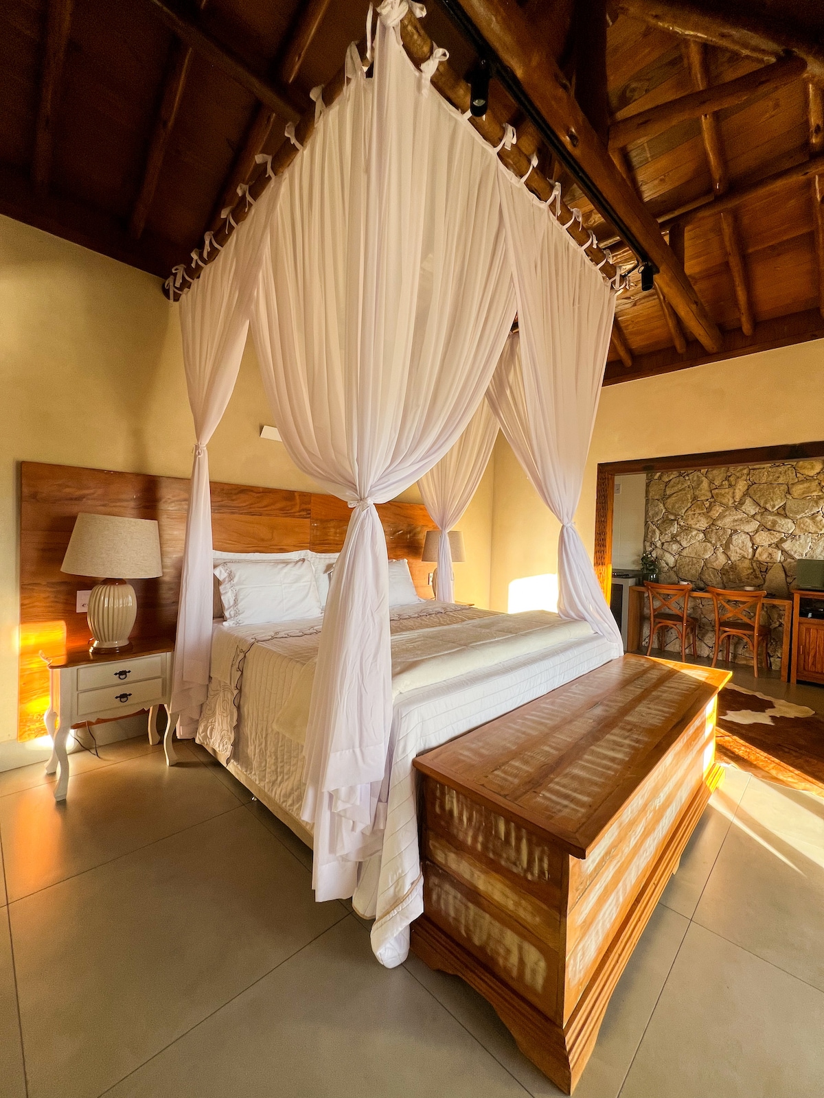 Hospede-se com elegância e conforto na histórica Vila de Itatiaia, distrito de Ouro Branco. Chalé Ouro é uma das hospedagens do charmoso Ventana Itatiaia, uma vila composta de café/armazém, ateliê e pequenos chalés para estadias inesquecíveis. A habitação conta com banheiro, frigobar, filtro de barro, cafeteira e alguns utensílios básicos. Não está incluso o café da manhã, porém o espaço conta com uma cozinha compartilhada completa, onde o hóspede pode preparar sua refeição, se assim preferir.