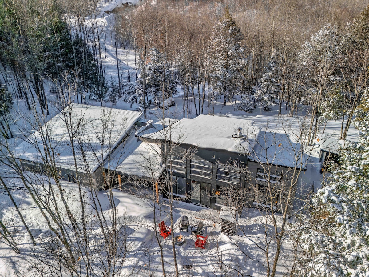 Escape to a luxury Nordic-style forest retreat, newly built in 2024 and set on a private estate near Saint-André-Avellin. This modern home sleeps up to 8 and features floor-to-ceiling windows, cathedral ceilings, and 2 living rooms: a main open-concept space with a fireplace and a separate entertainment room with a bar and foosball table. Enjoy a private outdoor heated lounge area and fire pit, high-speed Wi-Fi, and easy access to Montagnes Noires, Lac Simon, Parc Oméga, and Mont-Tremblant.