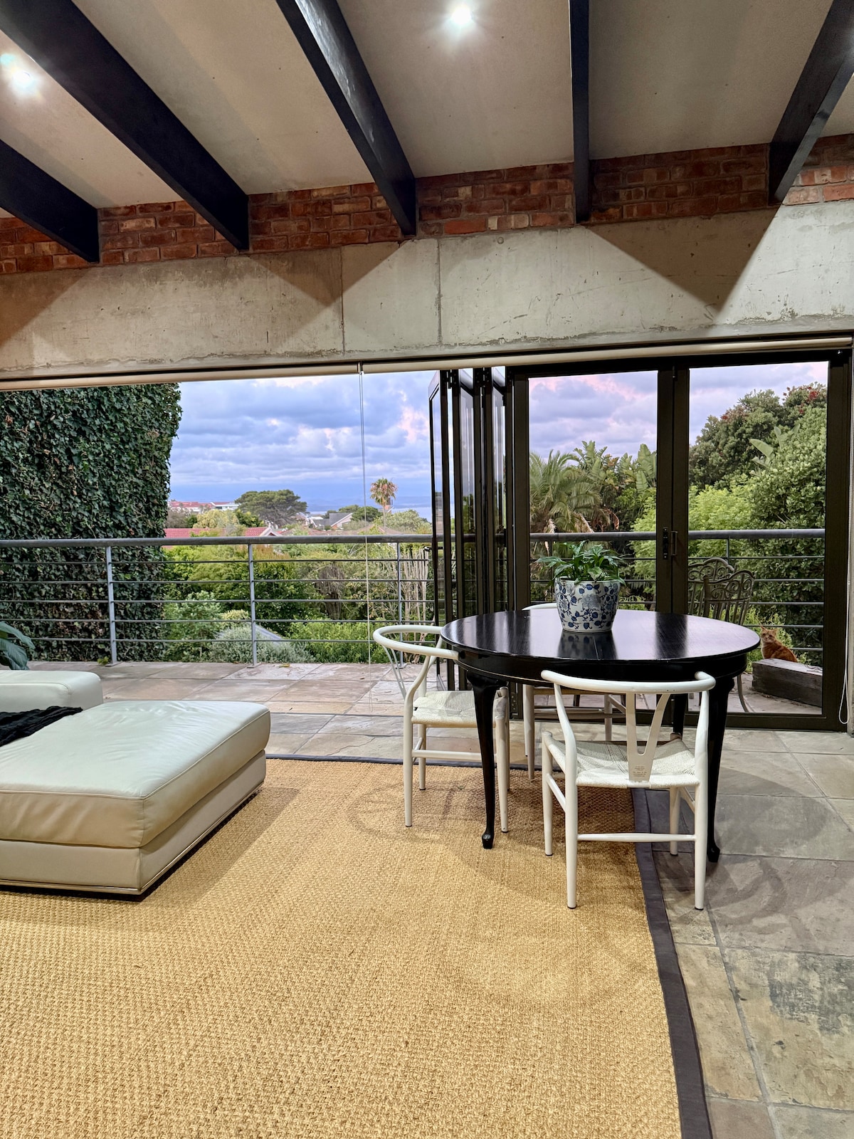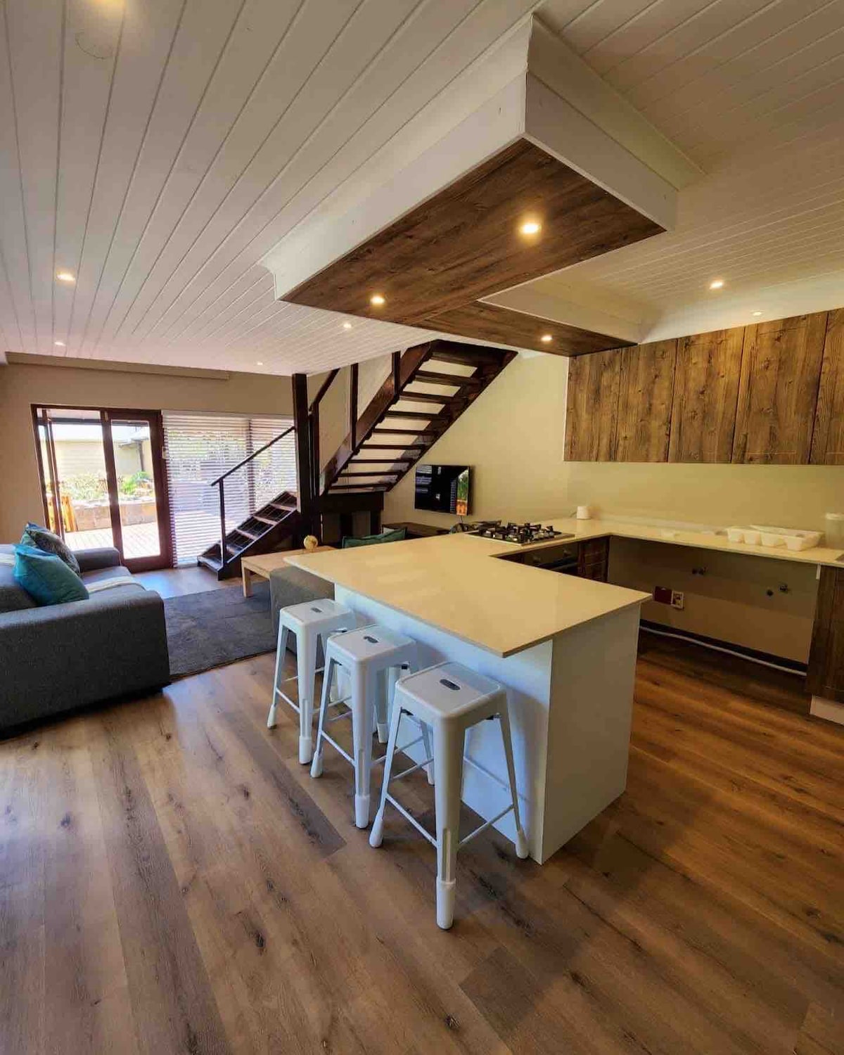 Soak in panoramic views of the Outeniqua Mountains from this light-filled, open-plan studio. Surrounded by indigenous trees. The upstairs studio features large windows, a fully equipped kitchen, queen-sized bed, and en-suite bathroom. Natural light fills the space, creating an inviting atmosphere. Downstairs, with its own private entrance, is a spacious second bedroom with a queen-sized bed, en-suite bathroom, and a small table and chairs.