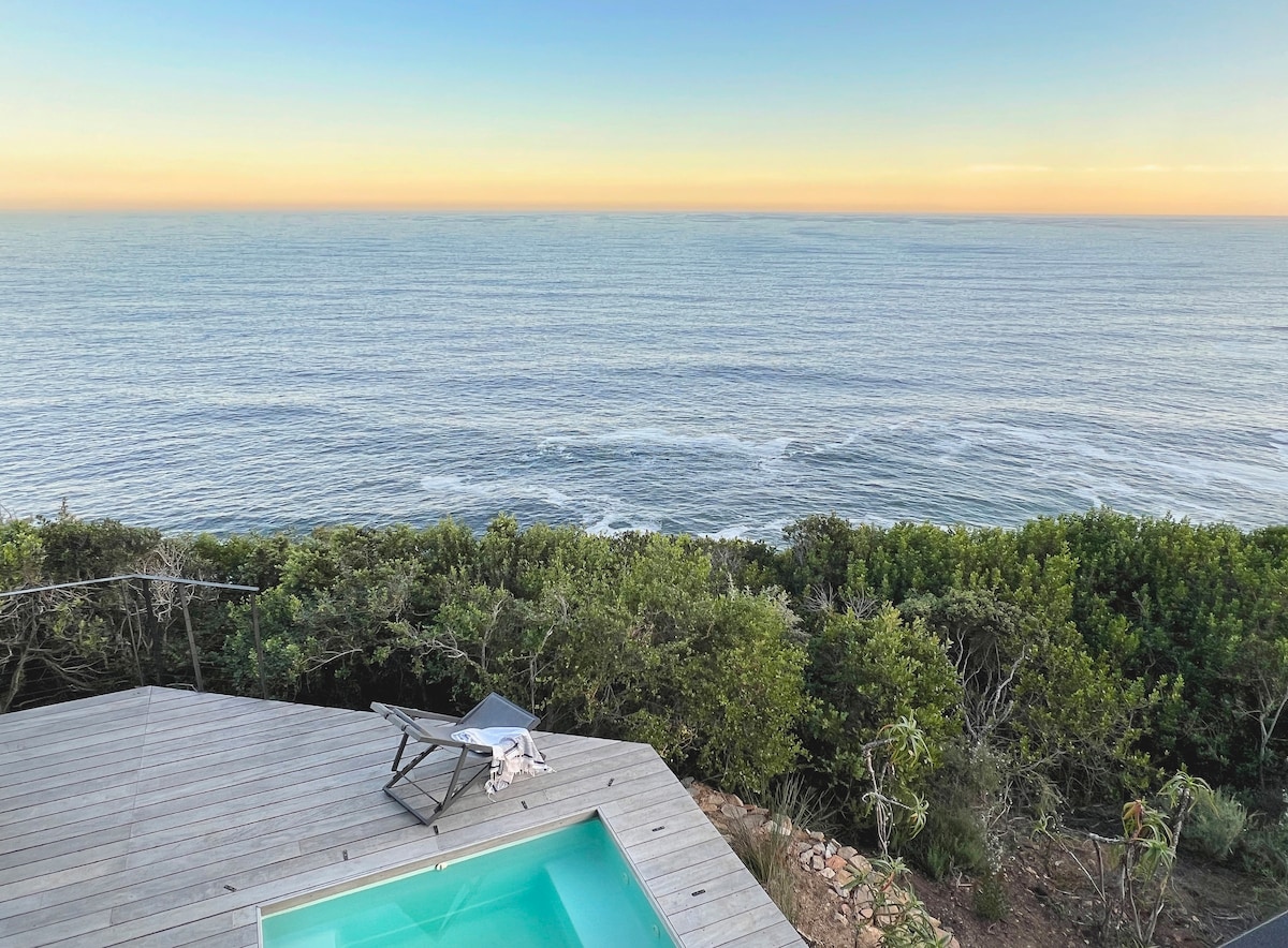 Experience the ultimate coastal lifestyle in our luxury cliff-top home with stunning ocean views from every room. Our organic modern design features natural wood and designer soft furnishings. Dip in our semi heated pool, or enjoy our yoga & chill deck or cook a meal in our designer kitchen. Complete with solar power system & set in a private nature reserve. Just 25 mins from George Airport, 15 mins from the Garden Route Mall and Wilderness. Come unwind in comfort & style.