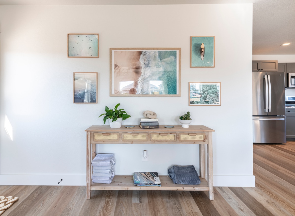 Relax & unwind in this newly built 725 sq ft guesthouse. Brightly lit w/high ceilings, big windows & minimalist decor. Wonderful full size kitchen w/new appliances+gas stove. Quiet & centrally located neighborhood 4 minutes to beach. Rinse off from the beach in private outdoor shower. Lovely deck & outdoor lounge chairs+dinning. Ground floor-Master bedroom has king bed. Upstairs open-air loft is the 2nd bedroom w/ 2 twin beds. MUST BE PHYSICALLY ABLE TO CLIMB LADDER STAIRS TO ACCESS LOFT(2ND BR)