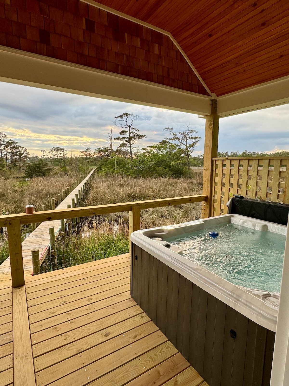 Built 2023 Tiny Modern Home SUP, hottub, kayaks, bikes, beautiful sunsets with a view of the Albemarle Sound! Modern and comfortable furniture, all new in May 2023. The entire house is separate and has one bedroom, full bathroom, living room and full kitchen. Beautiful rose garden and trees surrounding the porch. Great energy for couples on honeymoon or others wanting spending quality time together. Walking distance to the Albemarle Sound and 5 minute drive to the beach. YMCA enjoy as well